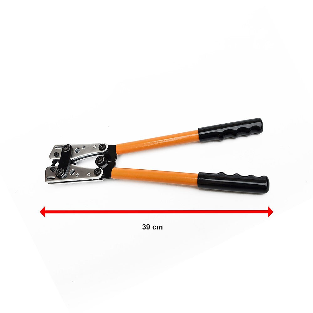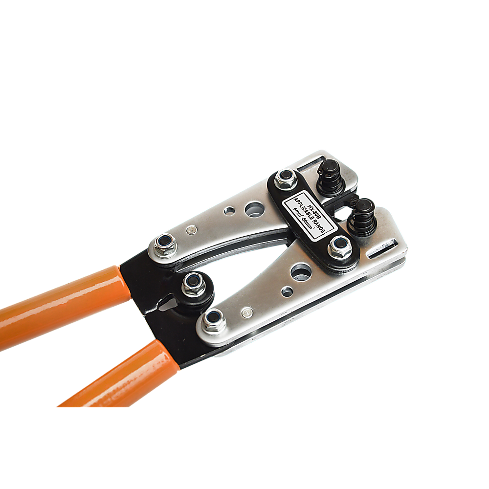 With six crimping sizes, you'll be able to work with wires of varying sizes, including 6 mm2 = 10 AWG, 10 mm2 = 8 AWG, 16 mm2 = 6 AWG, 25 mm2 = 4 AWG, 35 mm2 = 2 AWG, and 50 mm2 = 0 AWG.