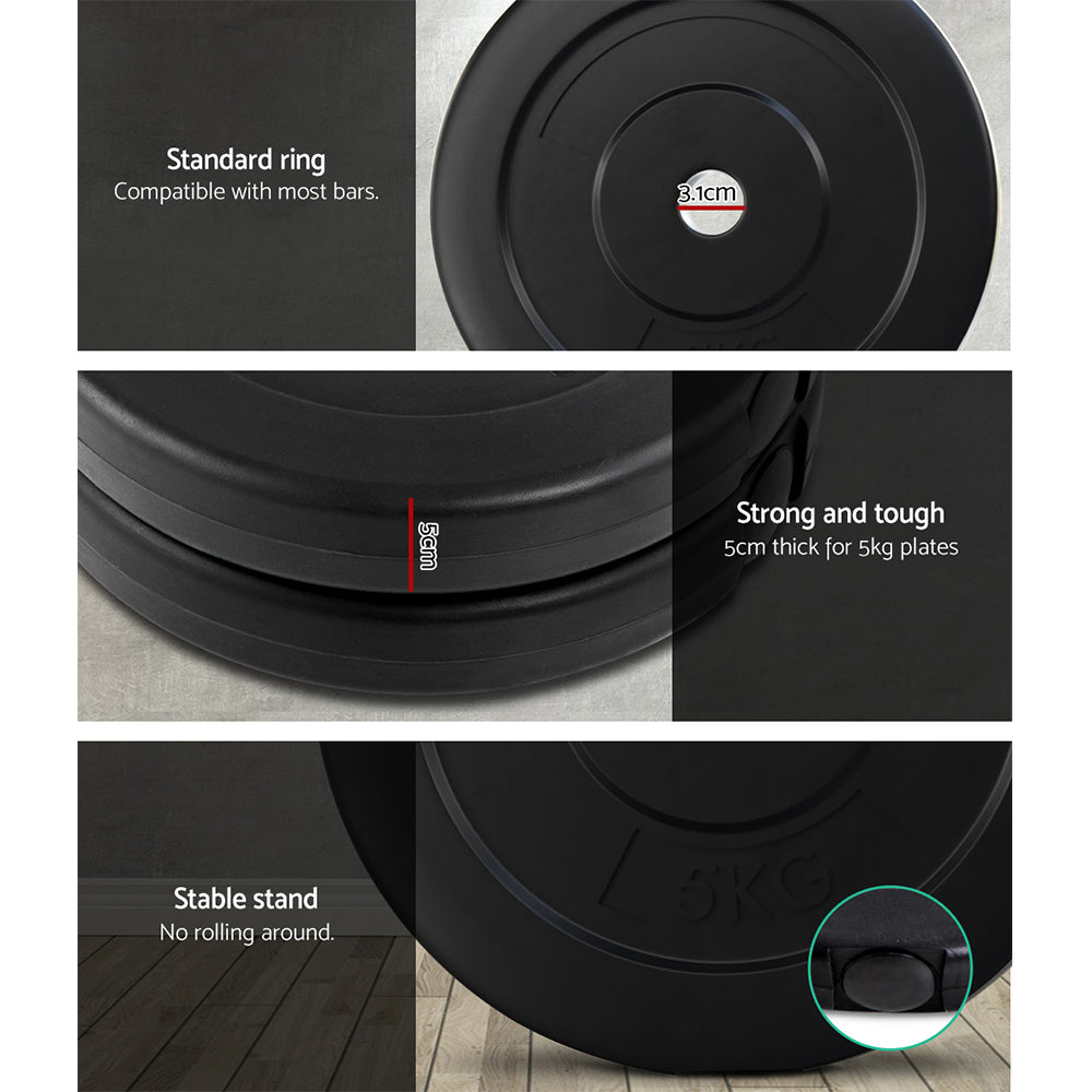 Made of strong materials, these Home Gym Weight Plates will allow you strengthen and tone your muscles at home with ease. These weight plates are filled with sand and covered with robust, floor-friendly rubber to minimize noise and floor damage. Easily add and remove plates to ensure an appropriate workout for your specific muscles. Plus, the included solid chrome plated steel Barbell Bar, holds up to 150kg and is compatible with most standard 31mm - 35mm hole weight plates, so you can work at any weight. Choose from the fitness range that is both good for your body and good for your wallet.