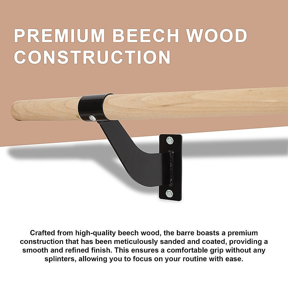 The barre features robust black brackets made of durable steel, securely fastened with screws. This reliable locking mechanism guarantees stability and eliminates any unwanted wobbling during use. With this Wall Mounted Ballet Barre, you can have complete confidence in its steadfastness.