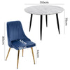 Let's introduce our latest dining table and chair set, which includes four blue velvet dining chairs and a white round table with marble effect.