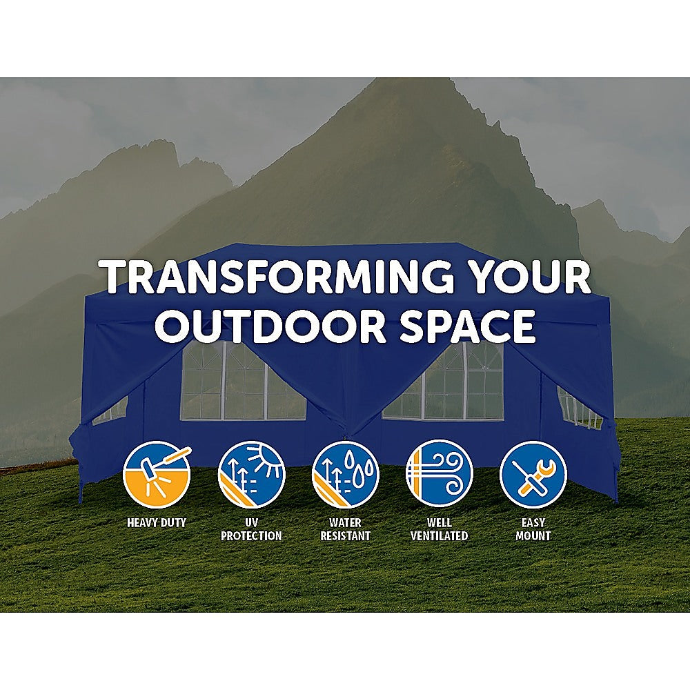 Featuring a thick steel frame and extra heavy-duty cloth material, the 3 x 6m Gazebo - Blue, is built to last, and designed to withstand most any weather condition. Beyond the classic tent design, 4 walls are included - for added privacy, shade, and protection from the elements. The 3 x 6m Gazebo - Blue, has the large dimensions, sturdy construction, and versatile wall features you need to beat the heat and make your next outdoor event a special one.