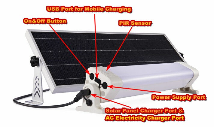 Here we introduce another high-quality energy-efficient solar-powered batten light which is the best in kind in the market. The 12w (1200Lumens) LED tube light which needs no electricity and minimum maintenance. You can use the provided remote control to switch the lighting mode between fix lighting and motion sensor lighting. This commercial quality LED tube light is widely used in many home and industrial applications. Its applications include but not limited to: garages and carports, garden sheds and outdoor entertainment areas, camping sites, and tents. The light is made from durable UV resistance ABC + PC and Aluminium Alloy. Its IP65 Ingress Protection rating means that the light is dustproof and waterproof. An solar panel with adjustable bracket included in the package. Versatile light head mounting bracket and a 5-meter connecting cable give you the flexibility to choose proffered location for the batten lights and set the lighting direction. This solar batten light can be used as a wall light or ceiling light. In-built powerful Lithium battery supports over 8 hours of lighting per night. It also grantees 4 nights of lighting after consecutive gloomy and rainy days. An add-on USB port for mobile phone charging makes it a perfect solution for temporary shelter/tent lighting and emergency camps or aid tents.