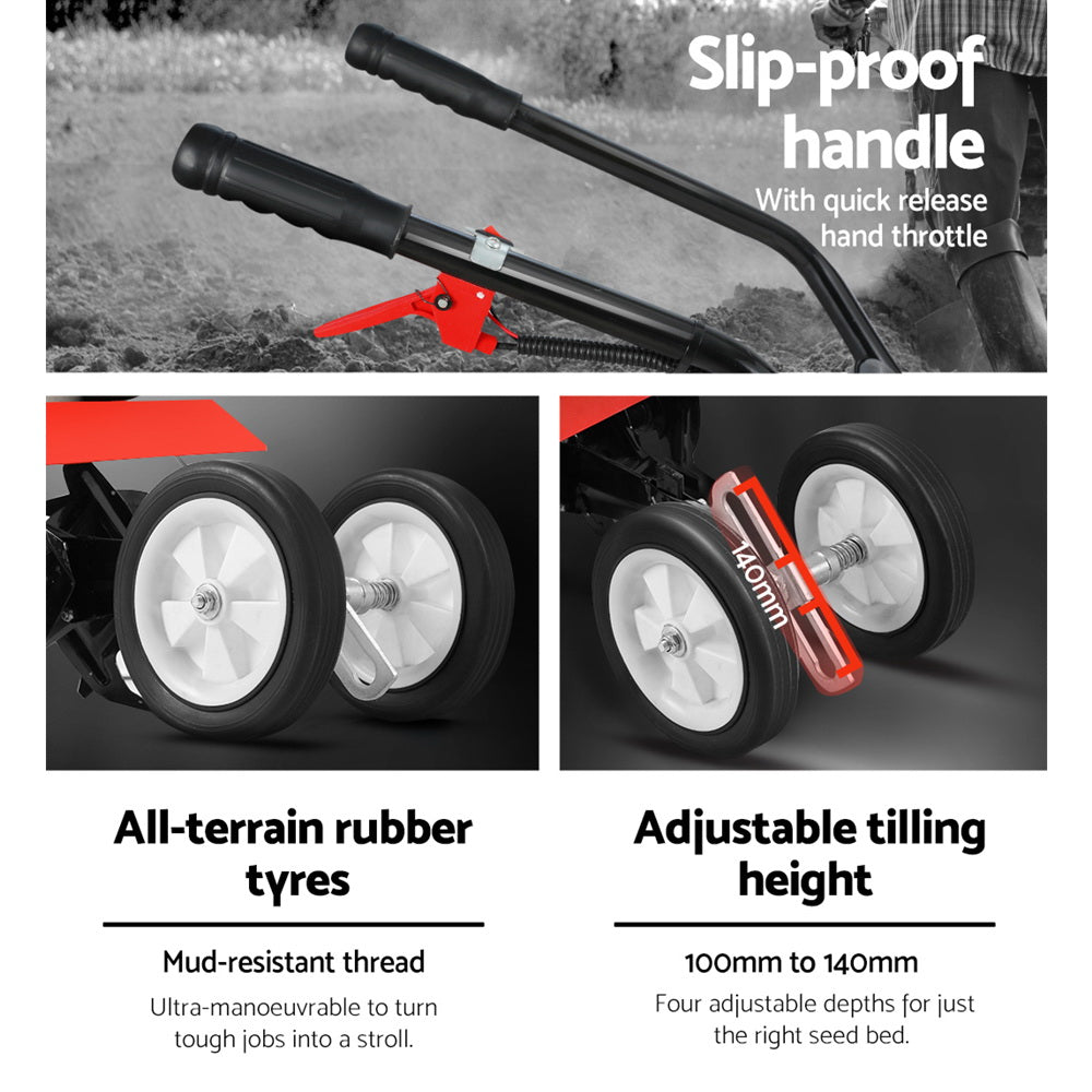 Get the earth moving quick and easy with the GIANTZ Hand-held Tiller. Featuring a 88cc 10,000rpm 2-stroke petrol motor, the tiller churns out soil deep and wide with its 24 teeth of hardened steel tines. The six blades allows you to till an extra-wide swath of 400mm and up to 150mm in depth in only one third of the time compared to four-blade models. In other words, you only need one pass with the tiller to pulverise the soil and get the right seedbed for your favourite crops. Operating the tiller is just as easy with its pull-start improved engine, steady handle and quick-release hand throttle control and all-terrain rubber tyres to transform back-breaking tilling work into a ground-breaking stroll. And when the tilling is done, just fold away the tiller and store with the rest of your tools. Ideal for the home gardener or small-scale commercial grower. This item comes with 1 year warranty.