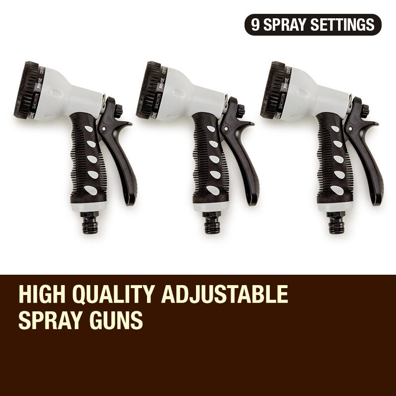 Included are three spray guns so one can be attached to each of your garden taps. Fine-tune your spraying action from mist to jet power with the 9 setting adjustable nozzle.
