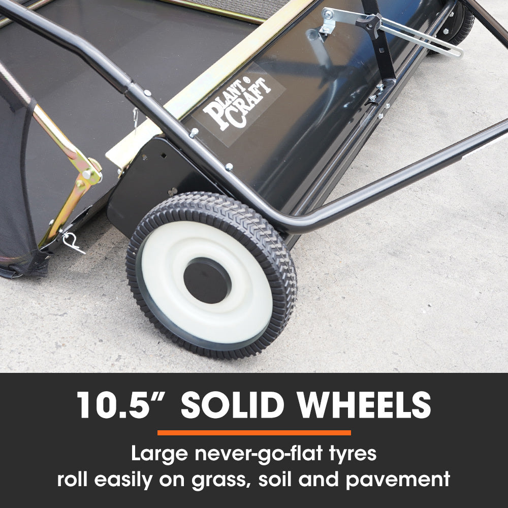 With 10.5" solid tyres and speeds of up to 8km/h, the PlantCraft tow-behind sweeper is a must have for your lawn. It also helps that it has a large nylon hopper and a huge load capacity of up to 415 litres. And when you're done, the convenient pull rope makes unloading the hopper a breeze.