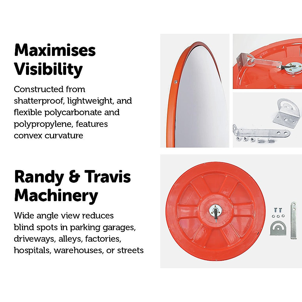 This 60-centimetre wide-angle convex road safety mirror from Randy & Travis Machinery provides motorists and pedestrians with better vision. With convex curvature, the mirror reduces or eliminates blind spots, allows drivers to better gage tight spots and corners in parking garages, driveways, or narrow streets. With eye-catching orange-red colour, drivers can receive advanced warning of hazards ahead, while its two-metre viewing distance gives drivers room to manoeuvre around the hazard safely.