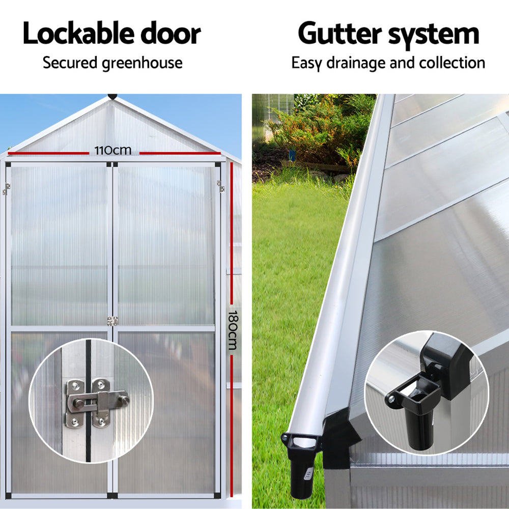 Our aluminium greenhouse has an internal volume of 20.91m³ and has ample space for a considerable number of plants and vegetables. It features a 4mm thick twin-wall UV-resistant polycarbonate panel construction that allows up to 90% light transmission and reduces the risk of plant burn. The aluminium framework is rust-resistant. The roof has additional bracings for strengthened support. Two adjustable roof vents ensure good air flow and moisture while an effective gutter system facilitates smooth drainage. The double doors are also lockable for security.