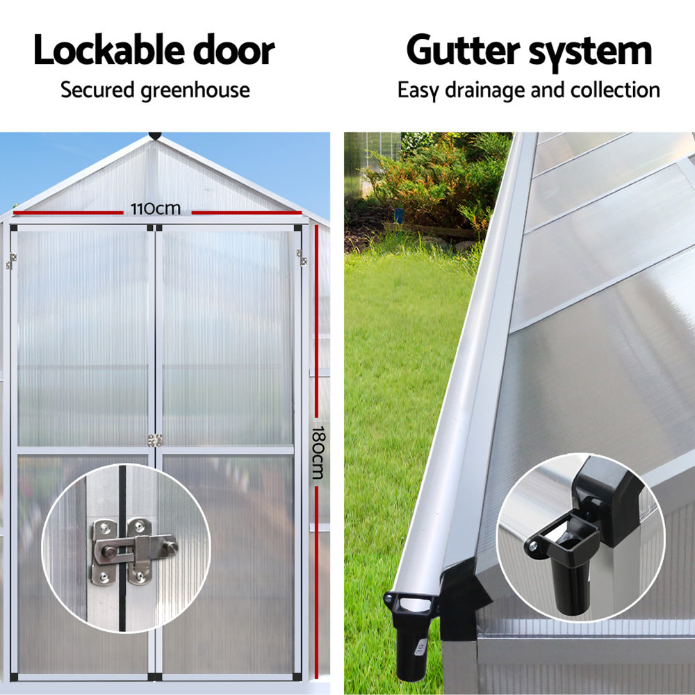 This spacious greenhouse has a massive volume of 17.64m3 and can accommodate a considerable number of plants and vegetables. Covered with 4mm thick twin-wall UV-resistant polycarbonate panels, the Green house allows up to 90% light transmission and helps to eliminate the risk of plant burn effectively. It also has a unique triangular Aluminium framework for enhanced durability and stability, two adjustable roof vents for good air flow and moisture and not least, an effective gutter system for smooth drainage.