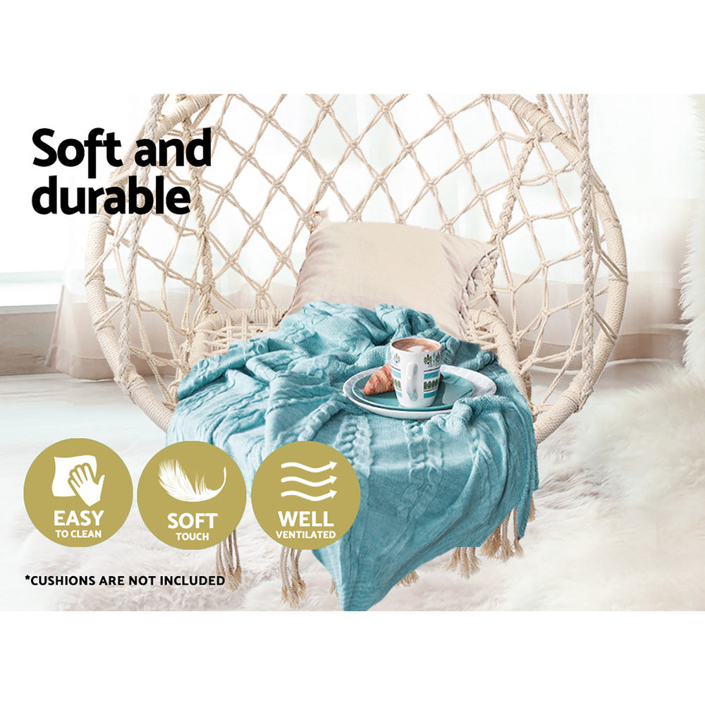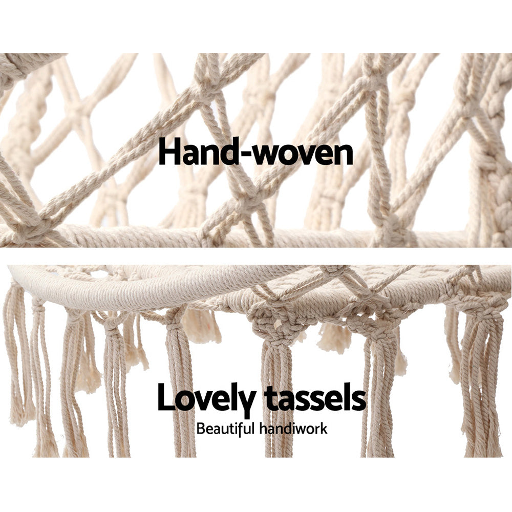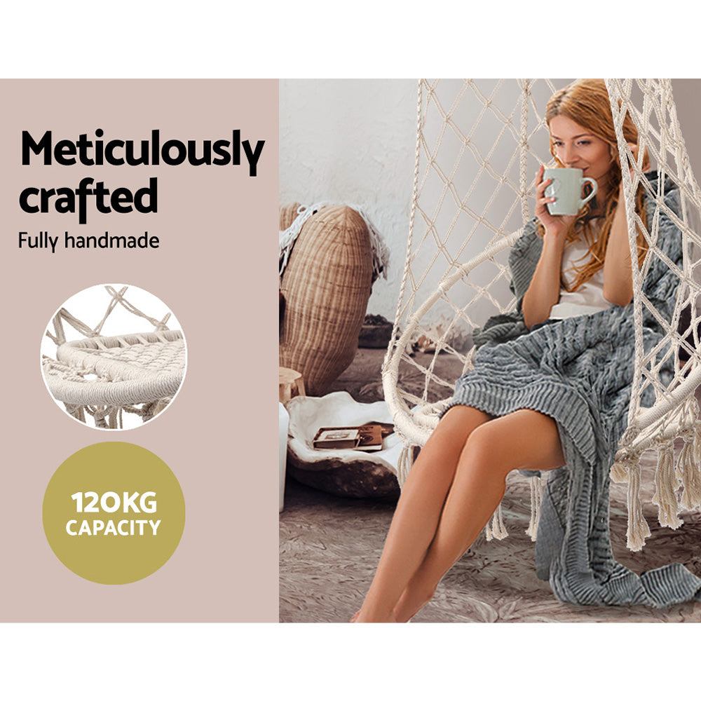 Lazy days and chill out moments. Somehow, they seemed to go better in our beautifully-crafted handmade Hammock Chair. Designed to cup you comfortably, our Hammock Chair is extremely relaxing to sit on with ample support for your back and arms. Built of a sturdy structure wrapped in a mix of polyester and cotton fabric, and adorned with lovely handcrafted tassels, our Hammock Chair has all the right vibes of days spent enjoying your favourite past times suspended in mid-air with nary a care in the world. String it over a tree, mount it at a verandah or install it inside the house, the Hammock Chair hangs well in any place for a very unique décor.