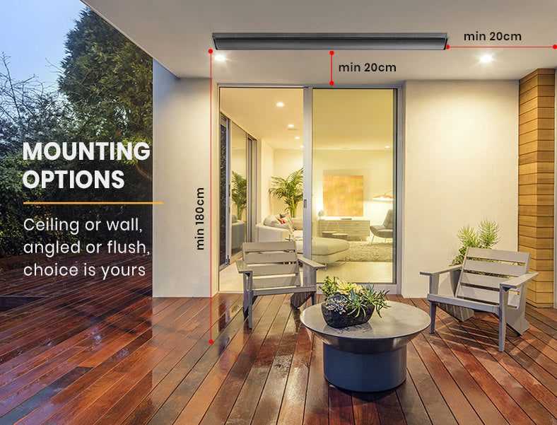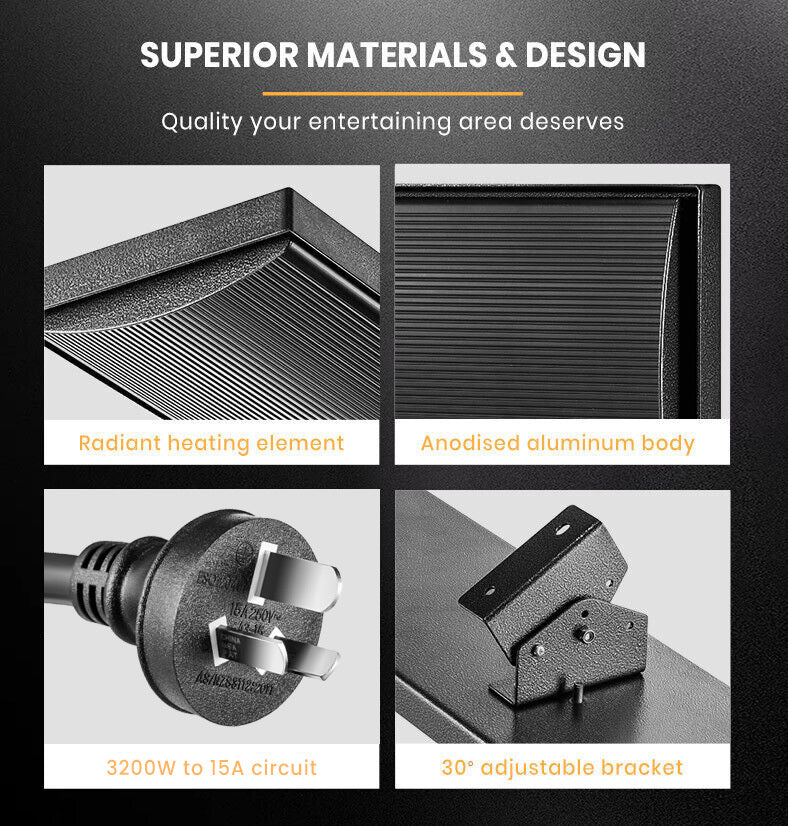 For each heater, a 3200 watt electric element is embedded in the black anodised aluminium strip that rapidly produces even and gentle heat dispersion. Plus, unlike gas heaters there is no glow or glare, and no need to refuel.