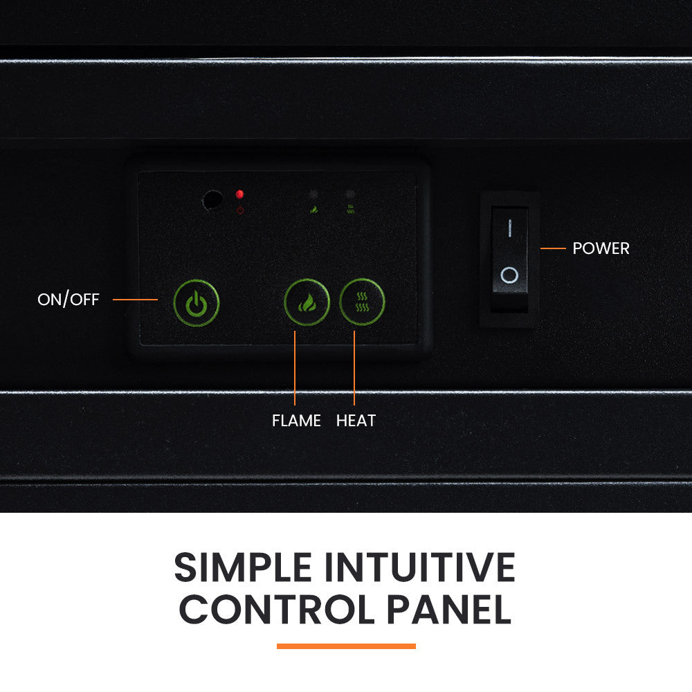 The controls are intentionally simple and neatly placed at the top of the heater to ensure easy access. You can select from an Eco Mode, or a Full Power setting for the colder Winter nights. It can be installed simply in your desired location recessed into a wall, where it simply slides in and sits on the floor. It is also a great option for installing within a traditional log fireplace mantle, so that you can still enjoy the warmth and look of a fire, without the usual hassles!