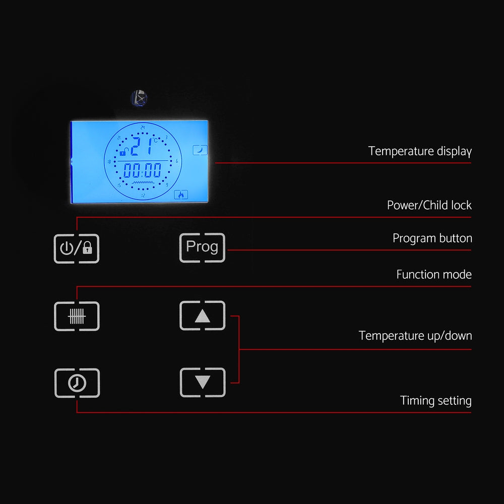 The Devanti Convection Heater is a versatile and efficient heating solution for your indoor space. With rapid heating, you can heat your home easily and quickly. The adjustable thermostat allows you to maintain a comfortable environment, while the LED digital display provides clear visibility of the current settings. The heater operates quietly, ensuring a peaceful and cosy atmosphere. It offers convenient features such as a 24-hour timer, an on/off switch, several convenient programming modes and a remote control for easy operation from a distance. Safety is a top priority with the inclusion of a safety cut-out switch and overheating protection. With flexible mounting options, whether you prefer to have it freestanding with smooth castor wheels or wall-mounted, the choice is yours. Keep your home cosy and comfortable in cold weather with the Devanti Convection Heater.