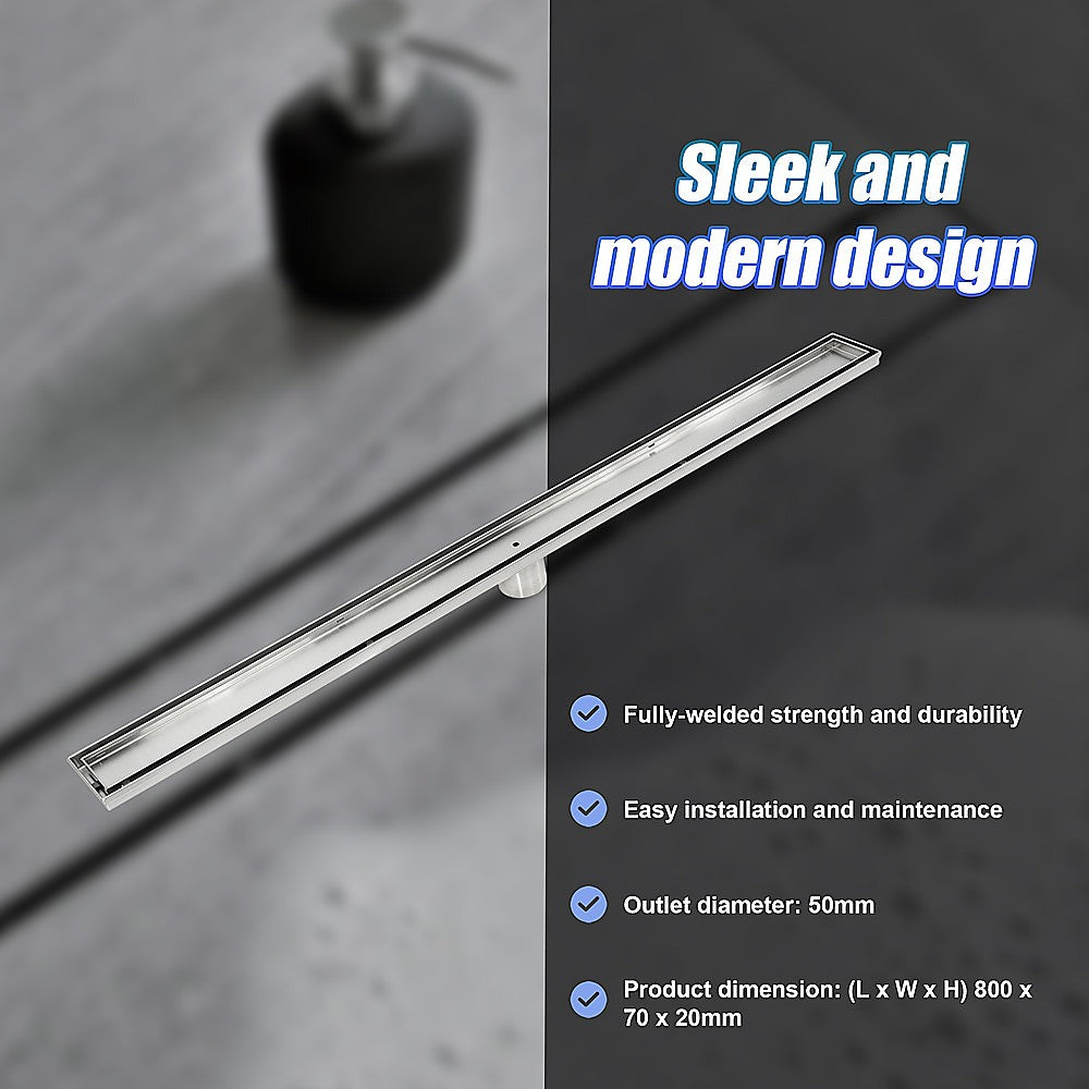 The practical yet eye-catching stainless steel shower grate features a frameless design that allows it to be seamlessly inserted into the shower's tiling configuration. The grate with its high quality 304 stainless steel construction provides durability and longevity as well as resistance to corrosion.