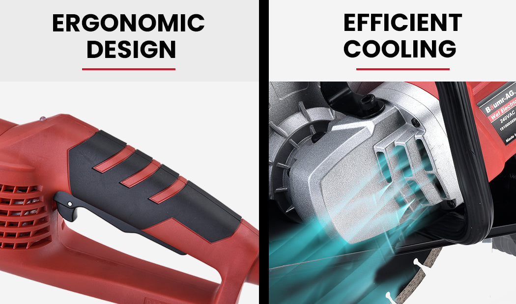 The Baumr-AG CSE-75 Electric Concrete Saw is loaded with enough grunt to power through just about anything - including driveways, brick, asphalt, stone, tiles, stone work and pavers. With 2400 watts of power on tap and the convenience of a 10 amp plug this powerful yet portable machine is the essential tool for your building site. No more mixing of fuels, excessive fumes and cold starting hassles – you can just push the start button and start doing steady cuts through high density materials!