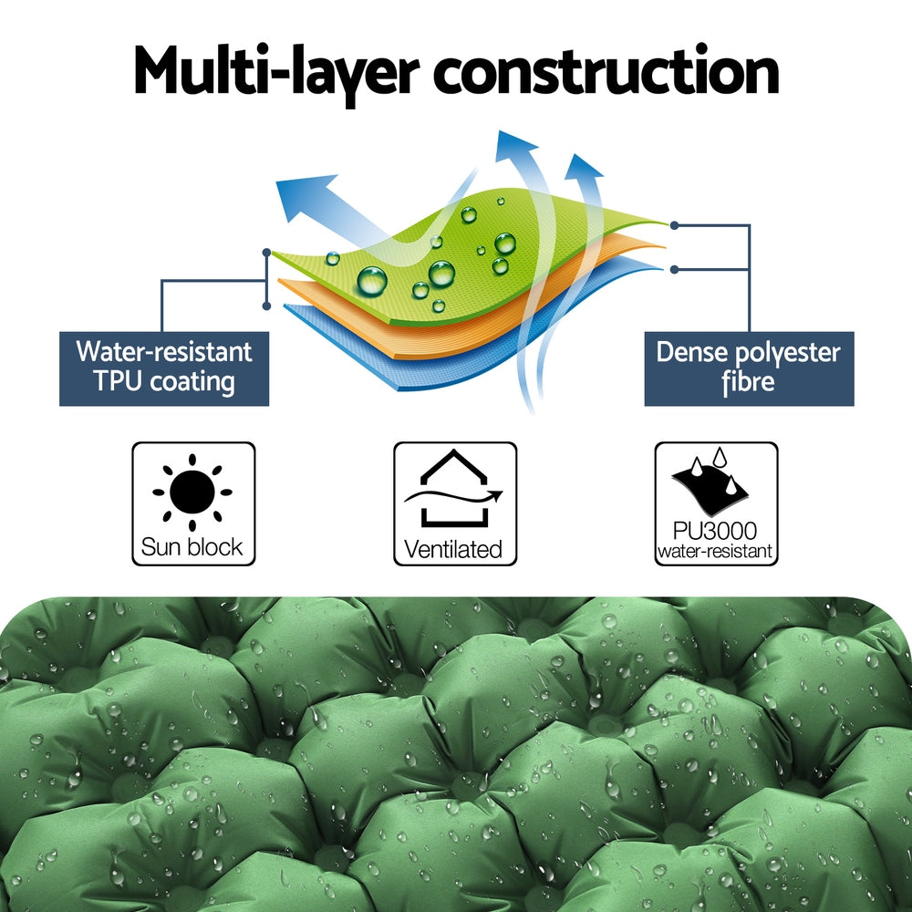 Looking for a comfortable night's sleep while camping? Look no further than the Weisshorn Self-Inflating Mat. With its efficient self-inflating valves, the mat can quickly inflate in 120 seconds. The TPU coating surface is durable and water-resistant, making it easy to clean and maintain no matter the surface. 9cm thickness mat with pillow is comfortable to sit and lie on during your trip. When you're finished, simply roll up your mat and put it in the provided carry bag for easy transportation and storage. Ideal for camping all year round, you'll love the convenience of the Weisshorn Self-Inflating Mat. Get yours today in preparation for the camping season.