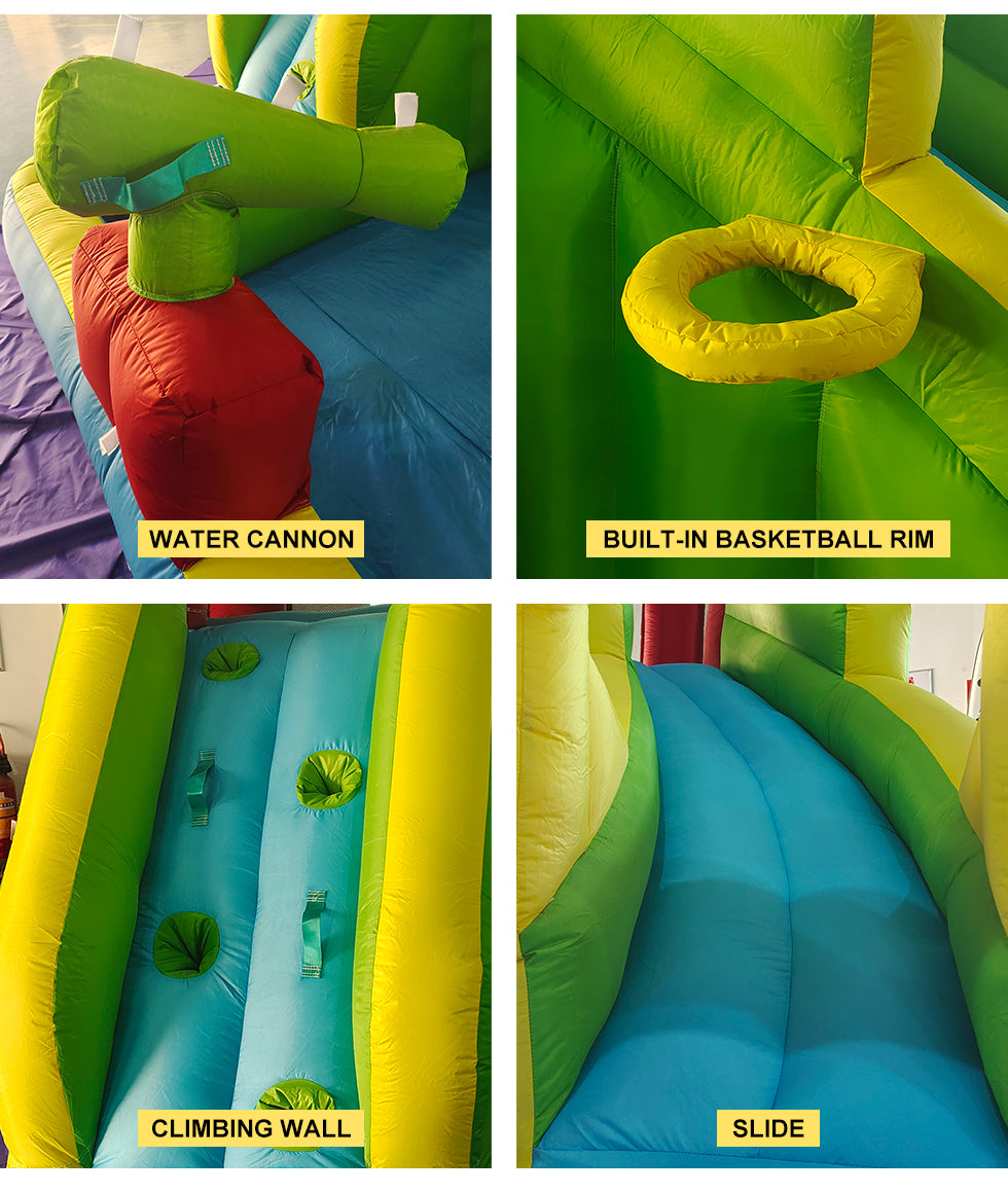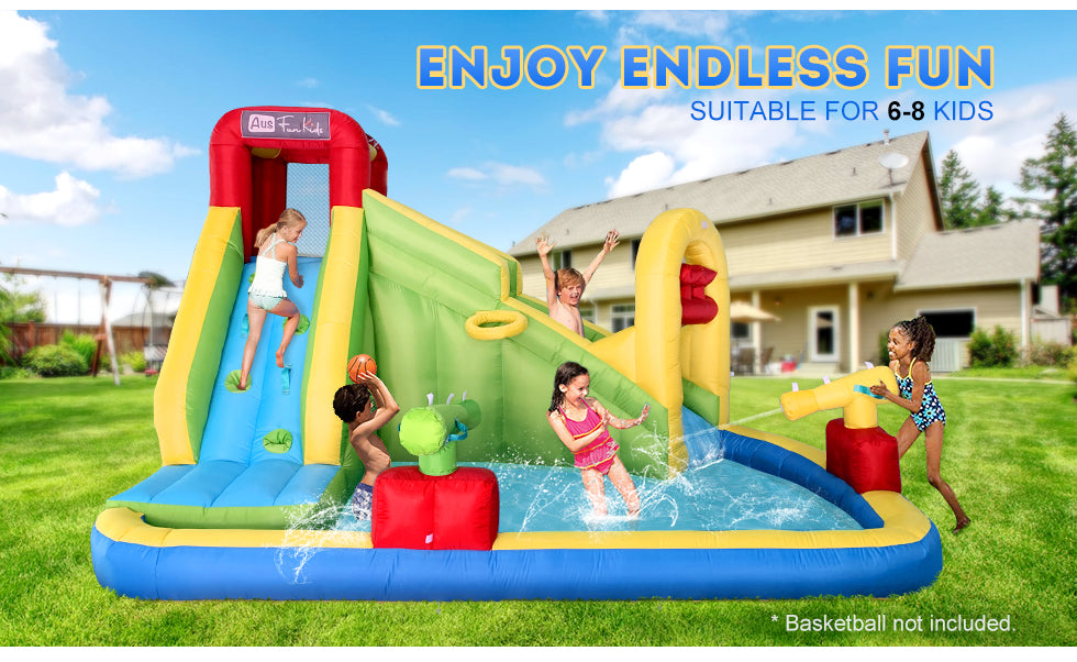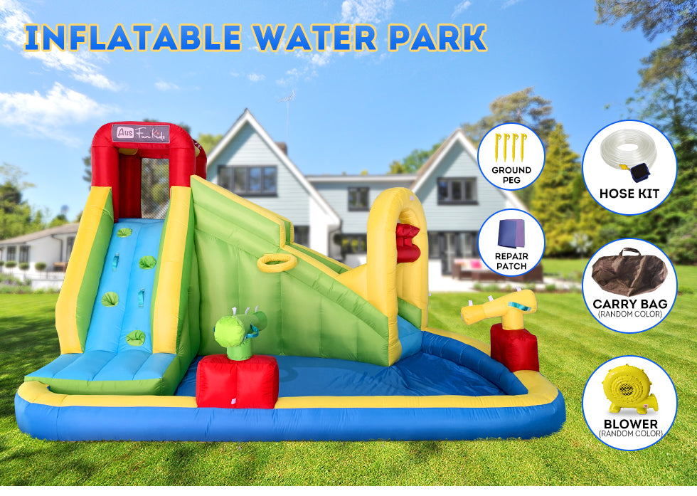 This inflatable water park castle is the best gift for your little ones. They can deeply enjoy it on the bouncer, climb, slide and splash pool. The castle can be inflated by a blower just in a few minutes, and well fixed by ground pegs. Then your kids can have pure fun on it! In any case, safety comes first, it is the same as this inflatable castle, which is made of high-quality Oxford nylon, includes a safety net and provides a safe experience. Moreover, the colourful design creates a more beautiful childhood for your lovely little ones.