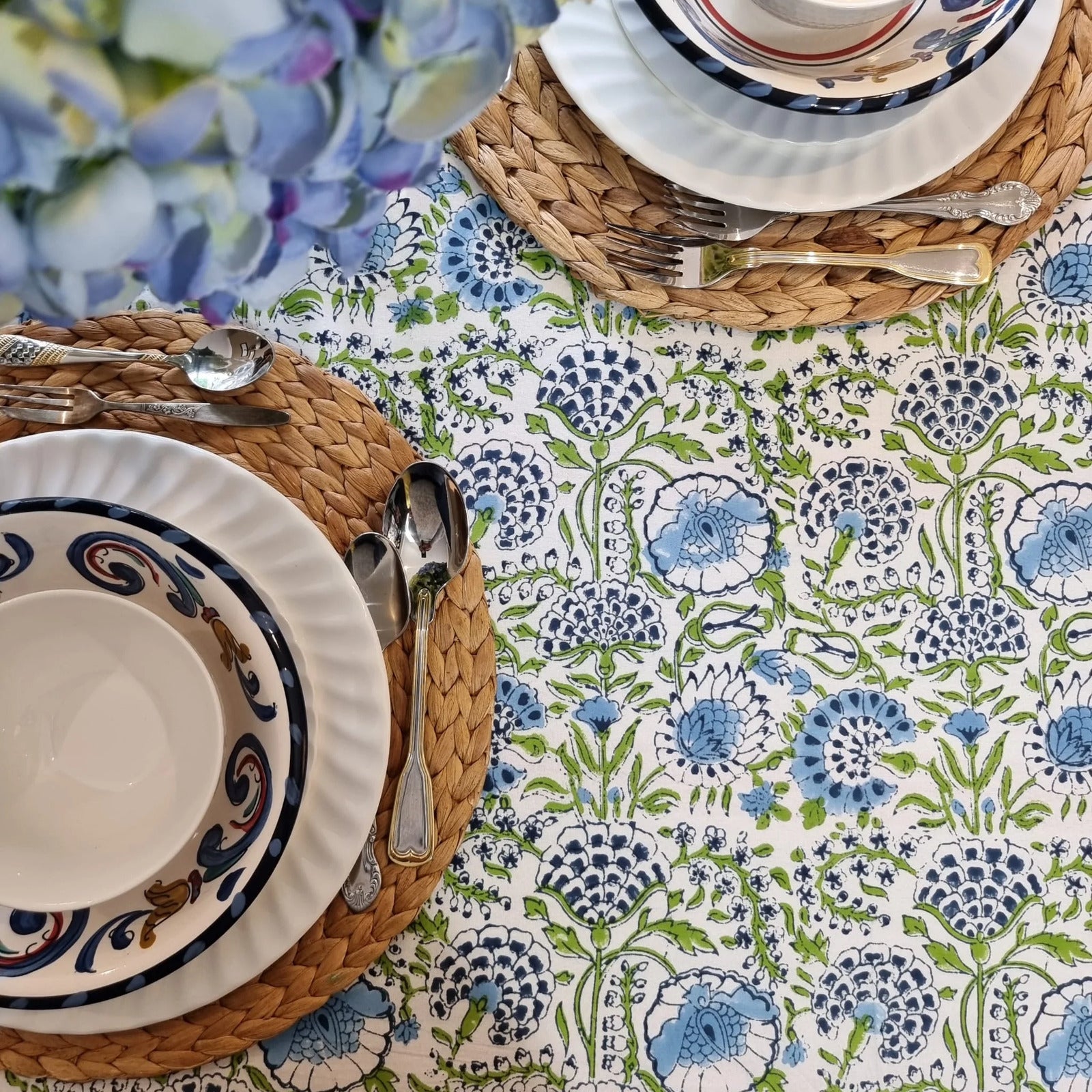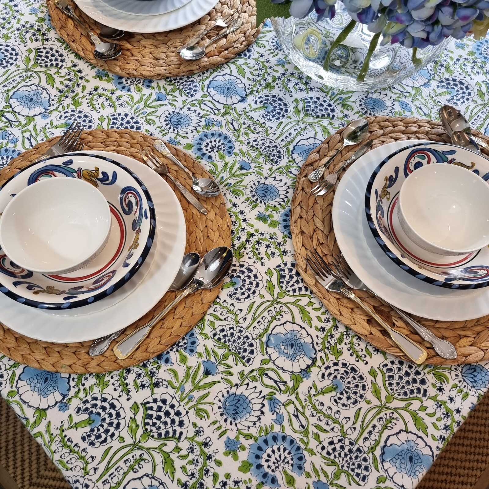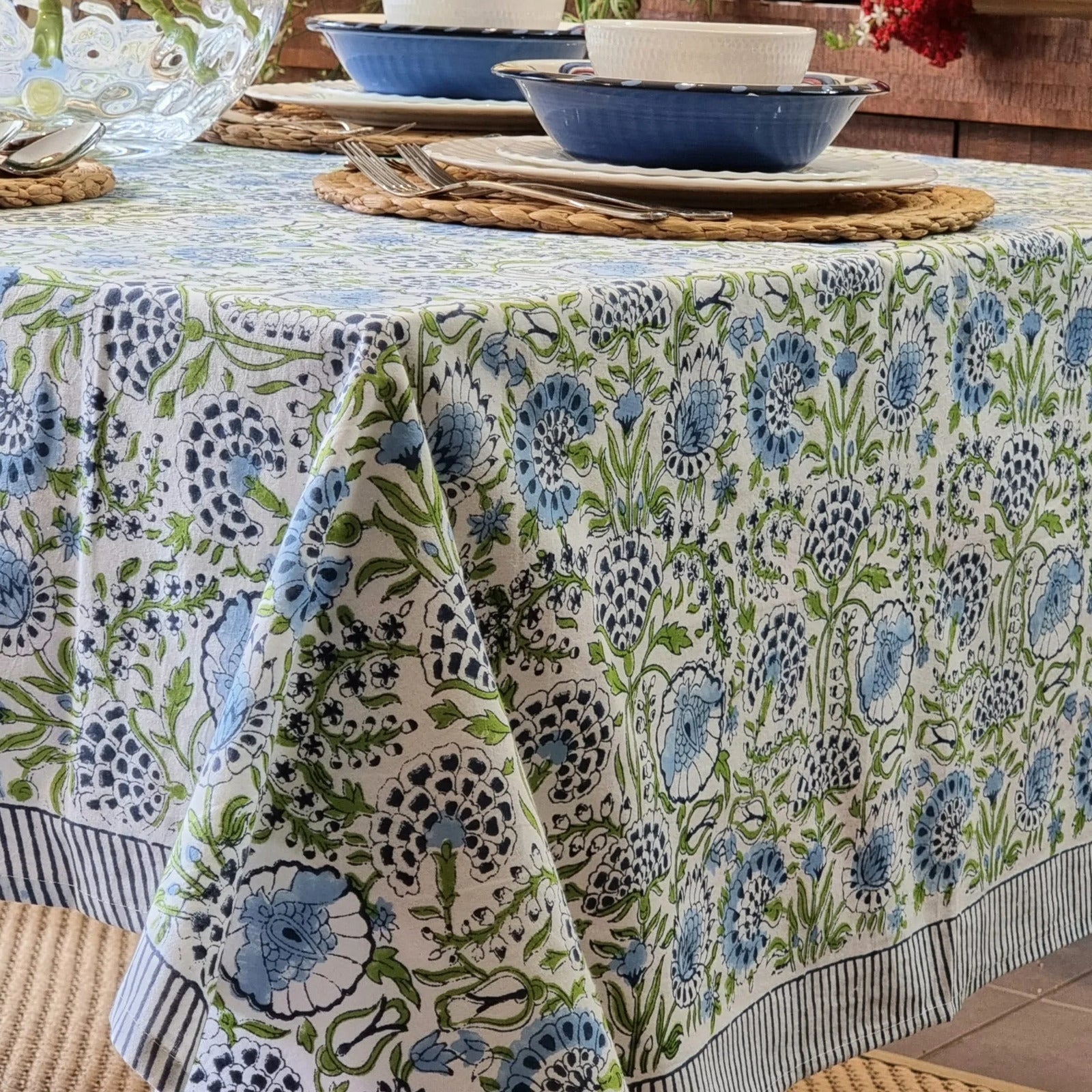Our hand-block-printed tablecloths are artistically created by skillful artisans in Rajasthan. The tablecloth is suitable for a 6-seater dining table.
