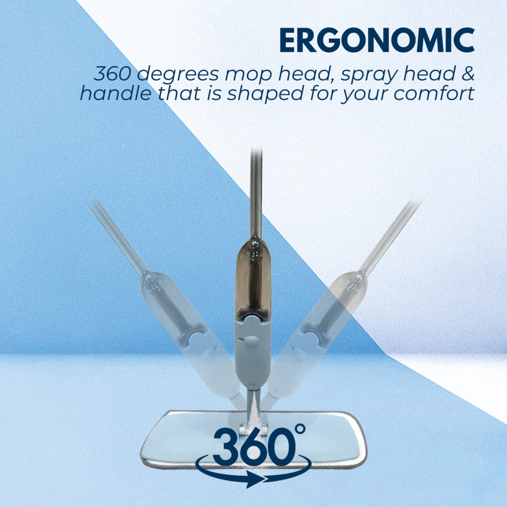 360 degrees mop head, spray head & handle that is shaped for your comfort