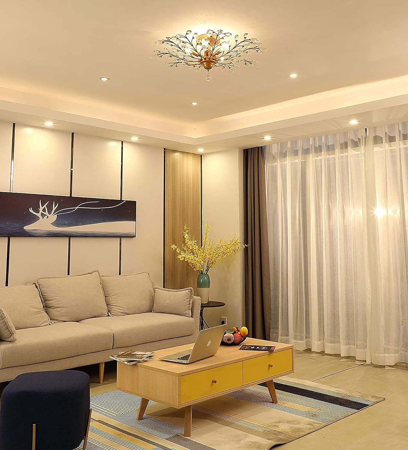 • ELEGANT ATMOSPHERE:This gold ceiling light is adorned with transparent glass crystals that capture and reflect the light of the bulb, creating a warm and inviting atmosphere. Its classic design is sure to add a touch of sophistication to any room.
