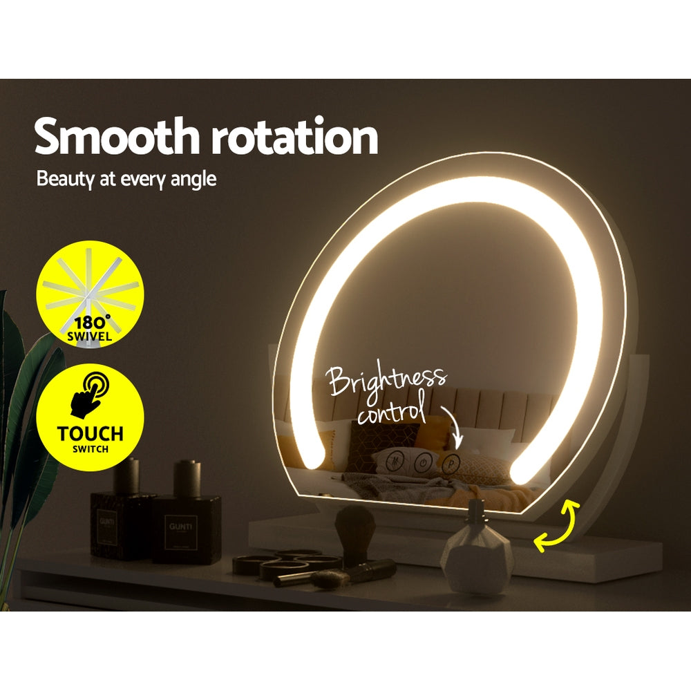Get the star treatment with our gorgeous Embellir Make-up Mirror. Framed with bright LED bulbs, this mirror really lights up your visage through your daily makeup regimen. The aluminium frame is sturdy, lightweight, and adds a touch of glamour to the entire mirror. The frame sits on an equally smooth powder coated MDF base for stability and durability. Put it straight on your existing vanity or mount to the wall for additional space. The mirror can be rotated 180° so you can look beautiful at every angle. Even more wonderful is that the LED light can be easily adjusted for brightness and colour temperature using our intelligent touch controls. Turn your bedroom or bathroom into a celebrity set overnight with our Embiller Make-up Mirror, and enjoy beauty in all its illuminated brilliance.