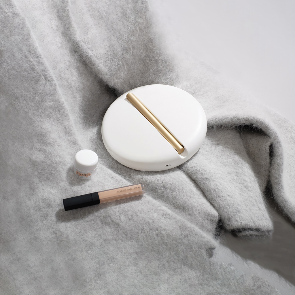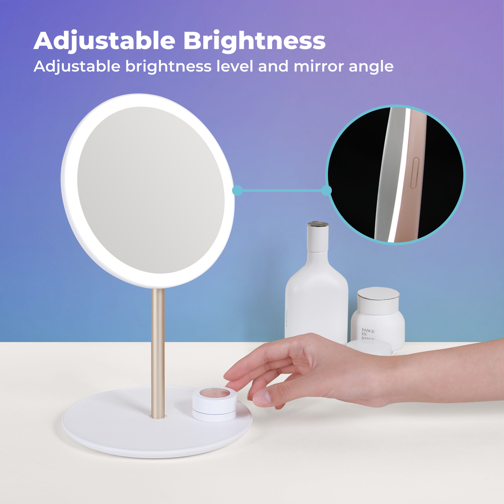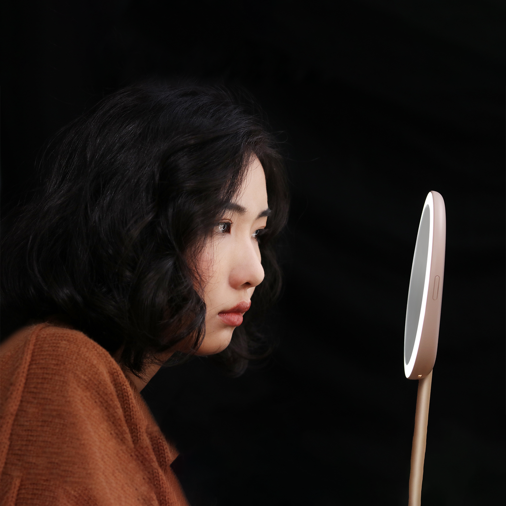 A minimalist beauty mirror integrated with multi-functions such as standing a bedside table lamp and acting as a mirror for makeup.