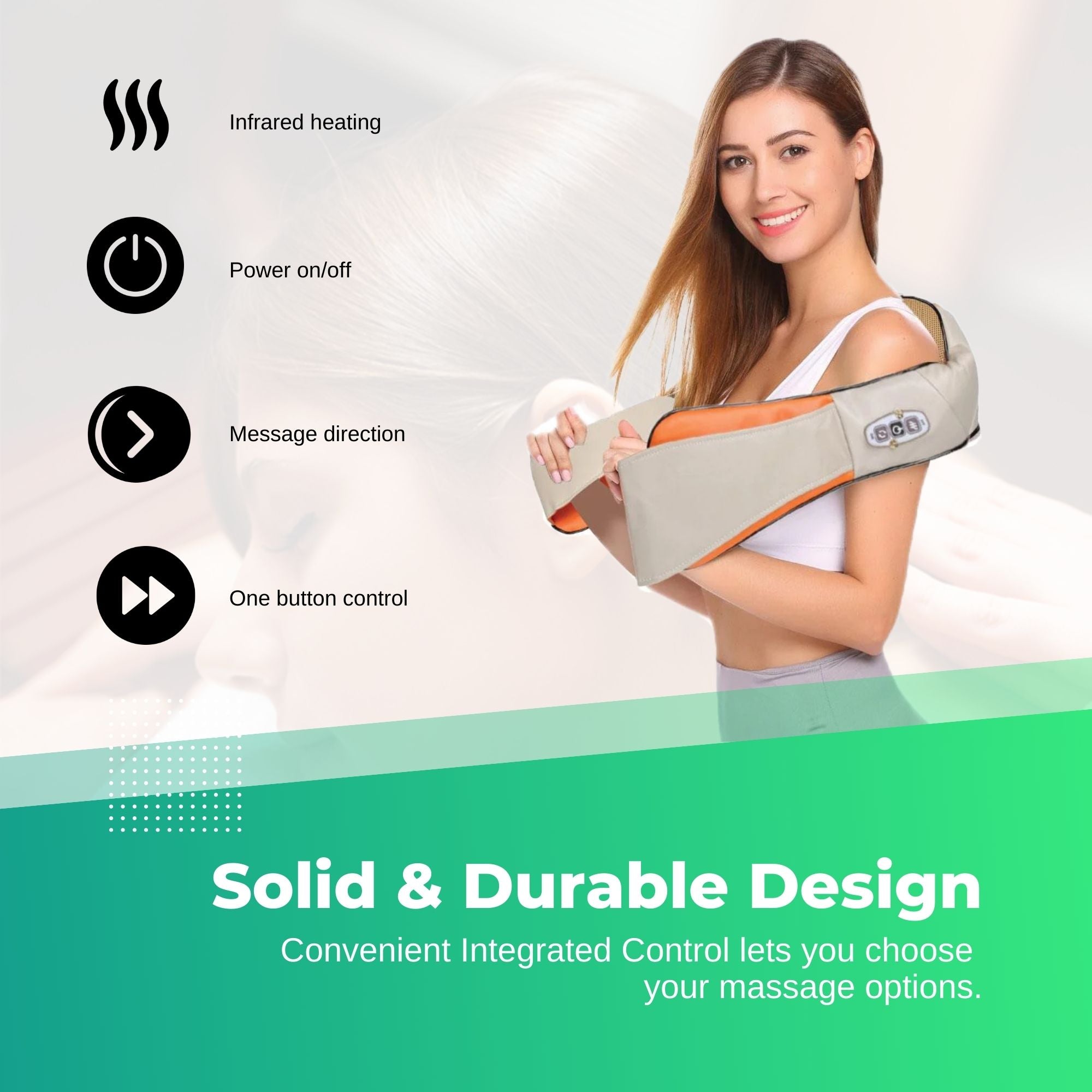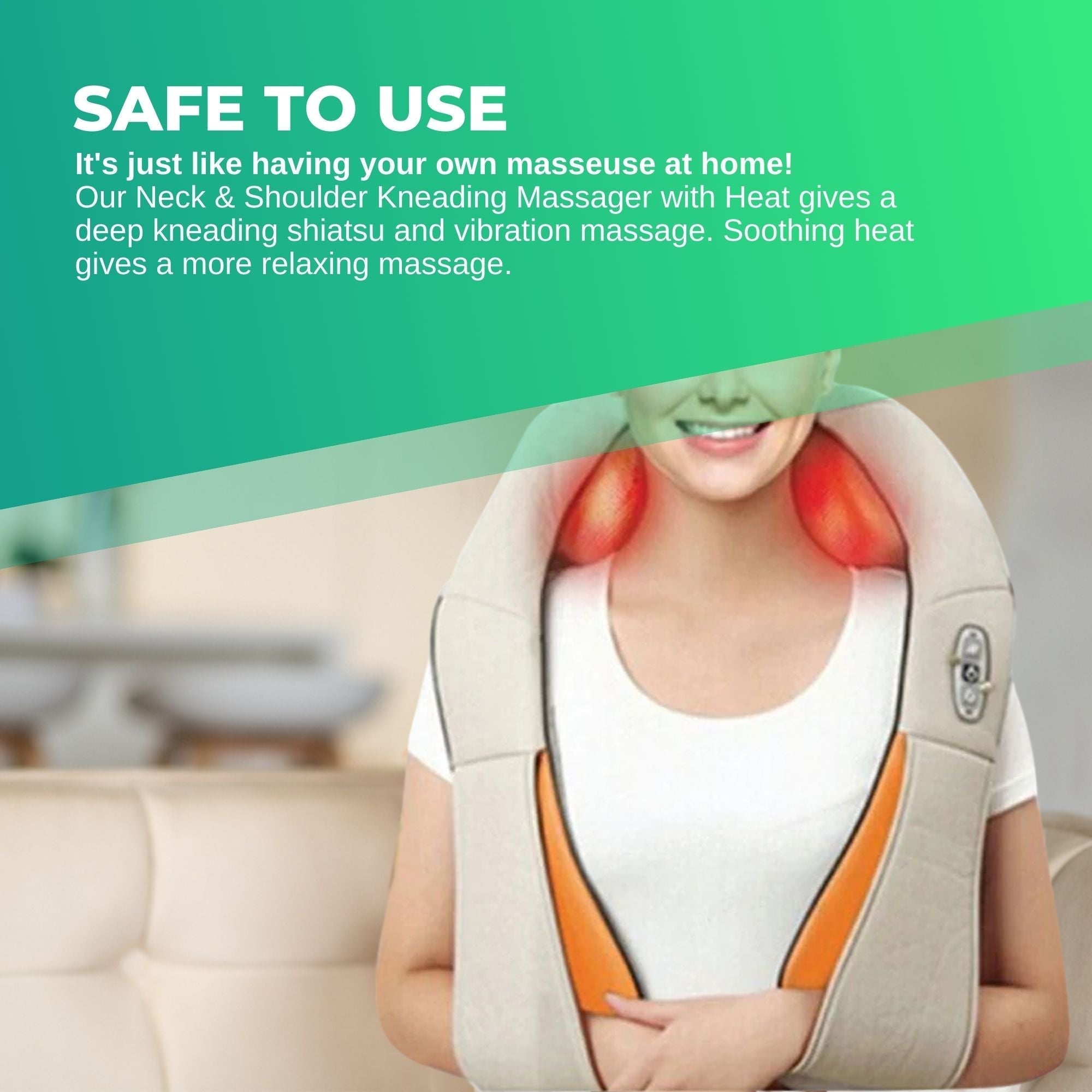 Our Neck & Shoulder Kneading Massager with Heat gives a deep kneading shiatsu and vibration massage. Soothing heat gives a more relaxing massage. Convenient Integrated Control lets you choose your massage options.