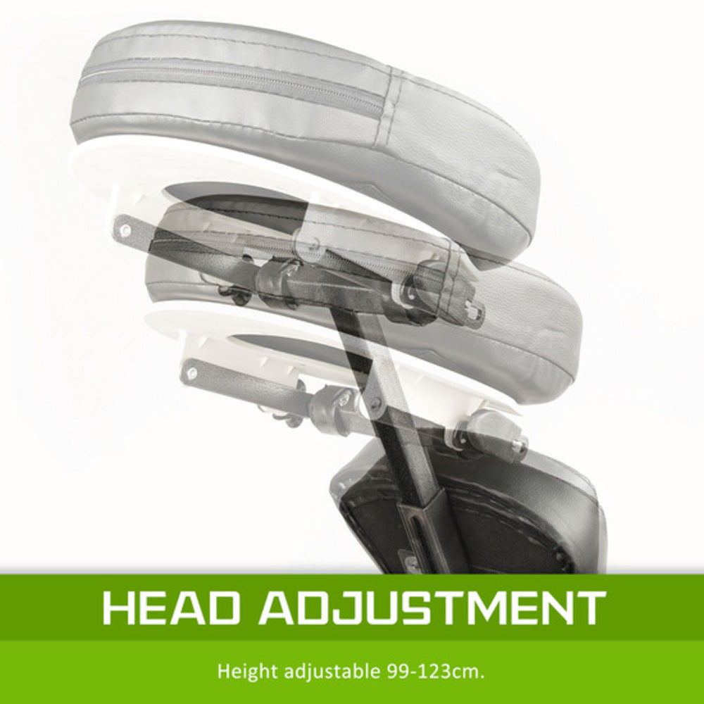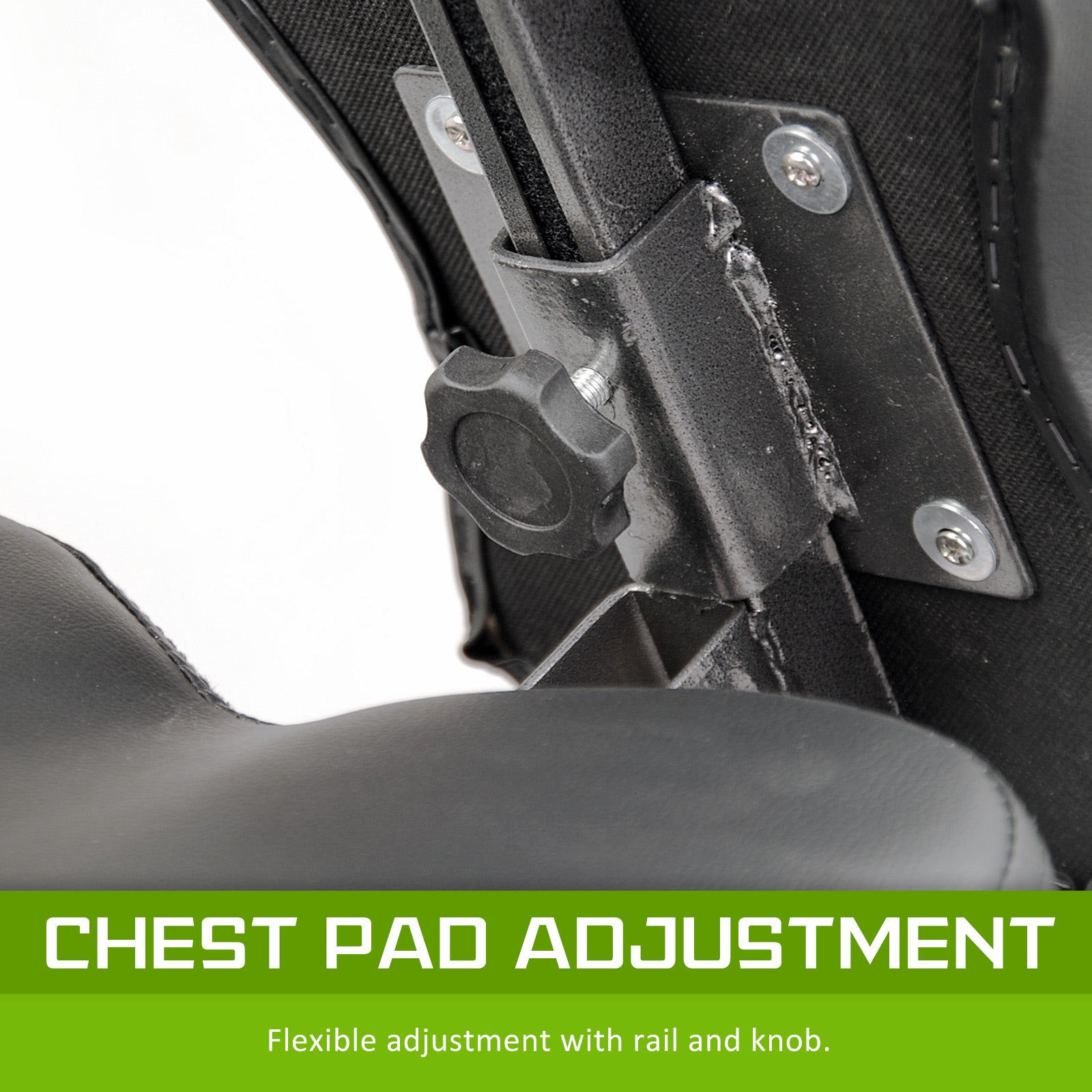 The chest pad is fully contoured for greater comfort for both men and women. The seat, armrest, chest pad and headrest are fully adjustable to accommodate user of different heights. The upholstery is comprised of two-inch thick high density small-cell foam padding and oil & water-proof vinyl.