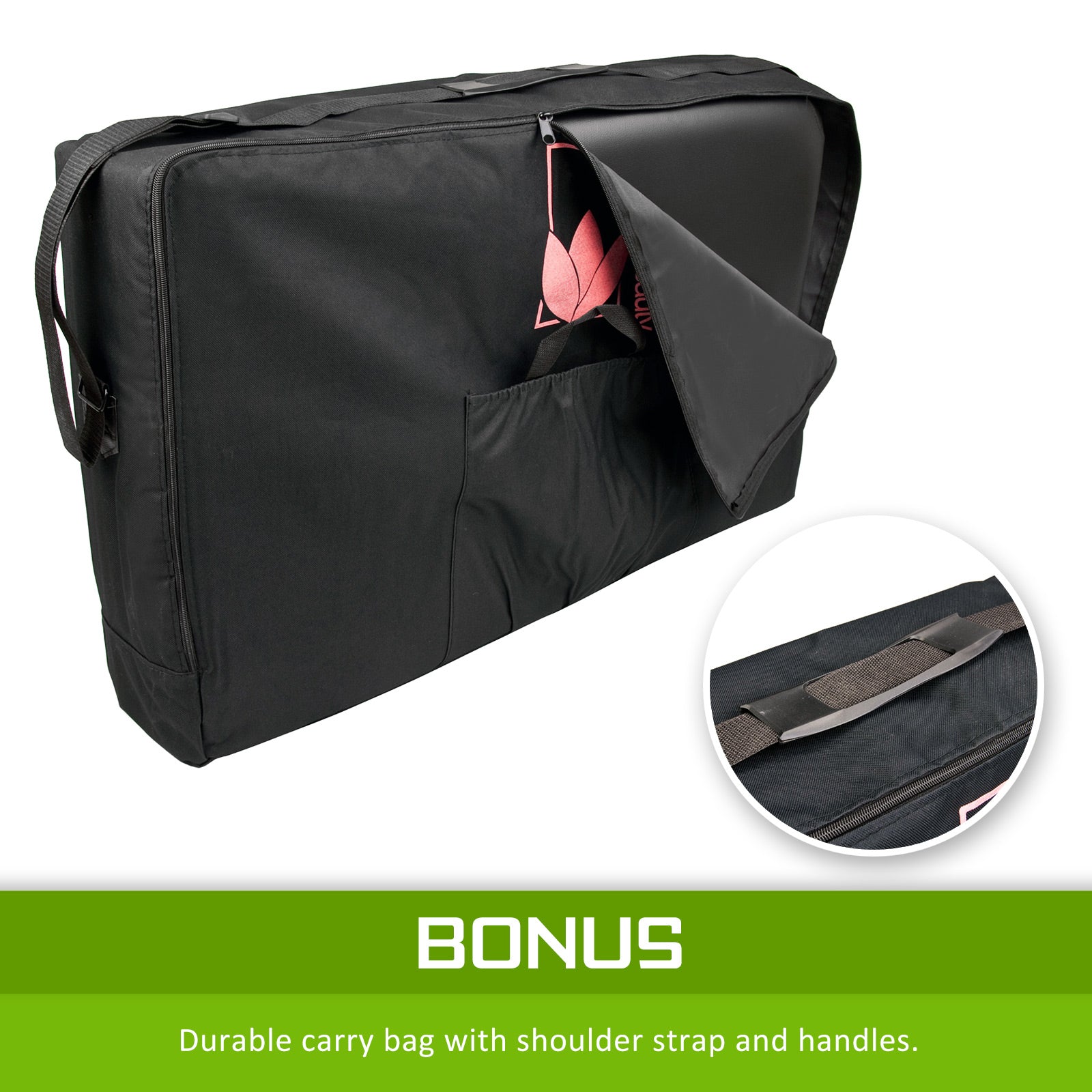 The upholstery is comprised of three-inch thick high density small-cell foam padding and oil & water-proof polyurethane vinyl. The heavy duty aluminium frame is strong and light weight, so if you need to transport it for work or simply need to rearrange your work environment it can be done very easily. In addition, it can be very compact when folded so it is easy to store and keep your storage tidy. It comes with a carry bag to add to your convenience and also to keep it clean when not in use. This massage table is ideal for students, new practitioners, and home users with limited budgets.