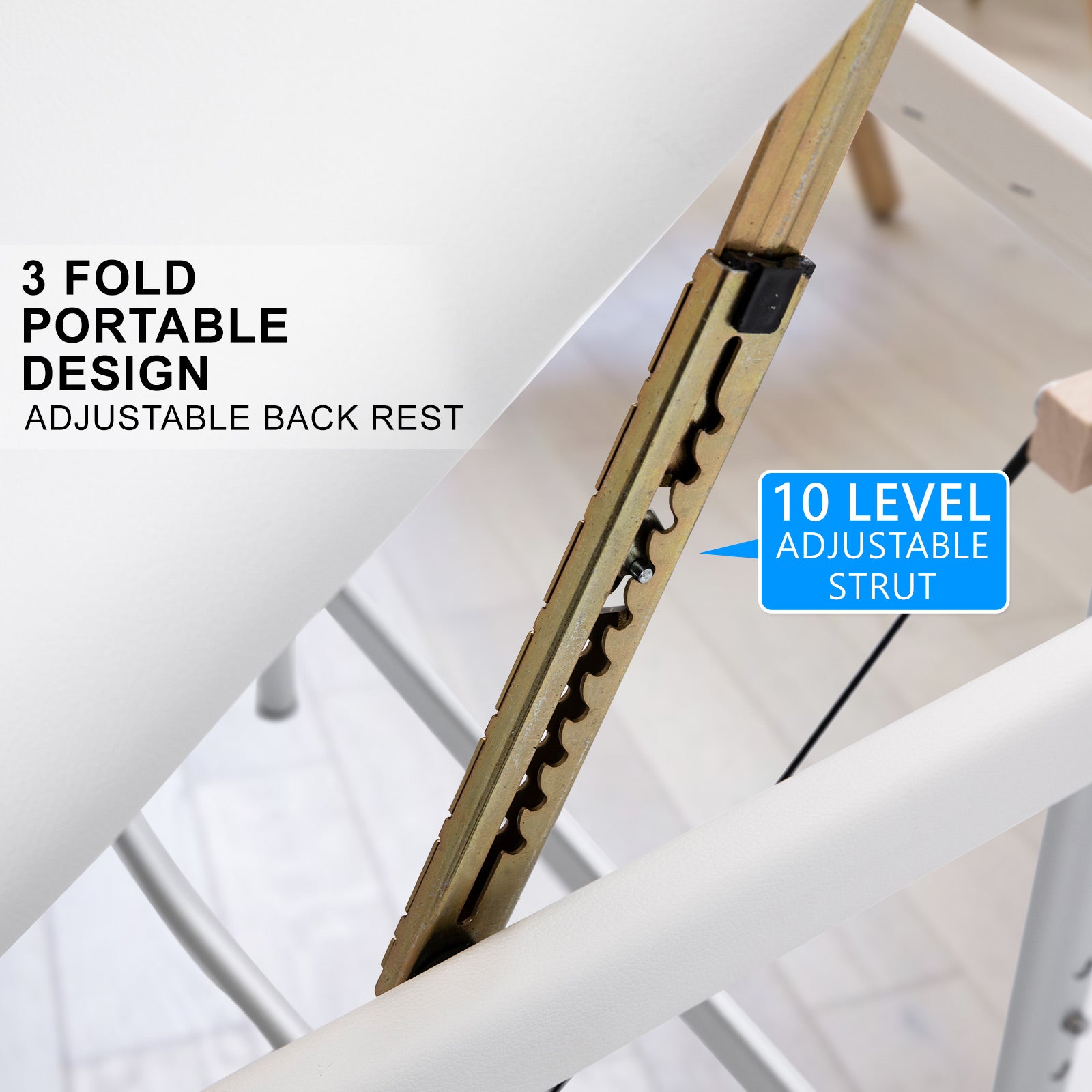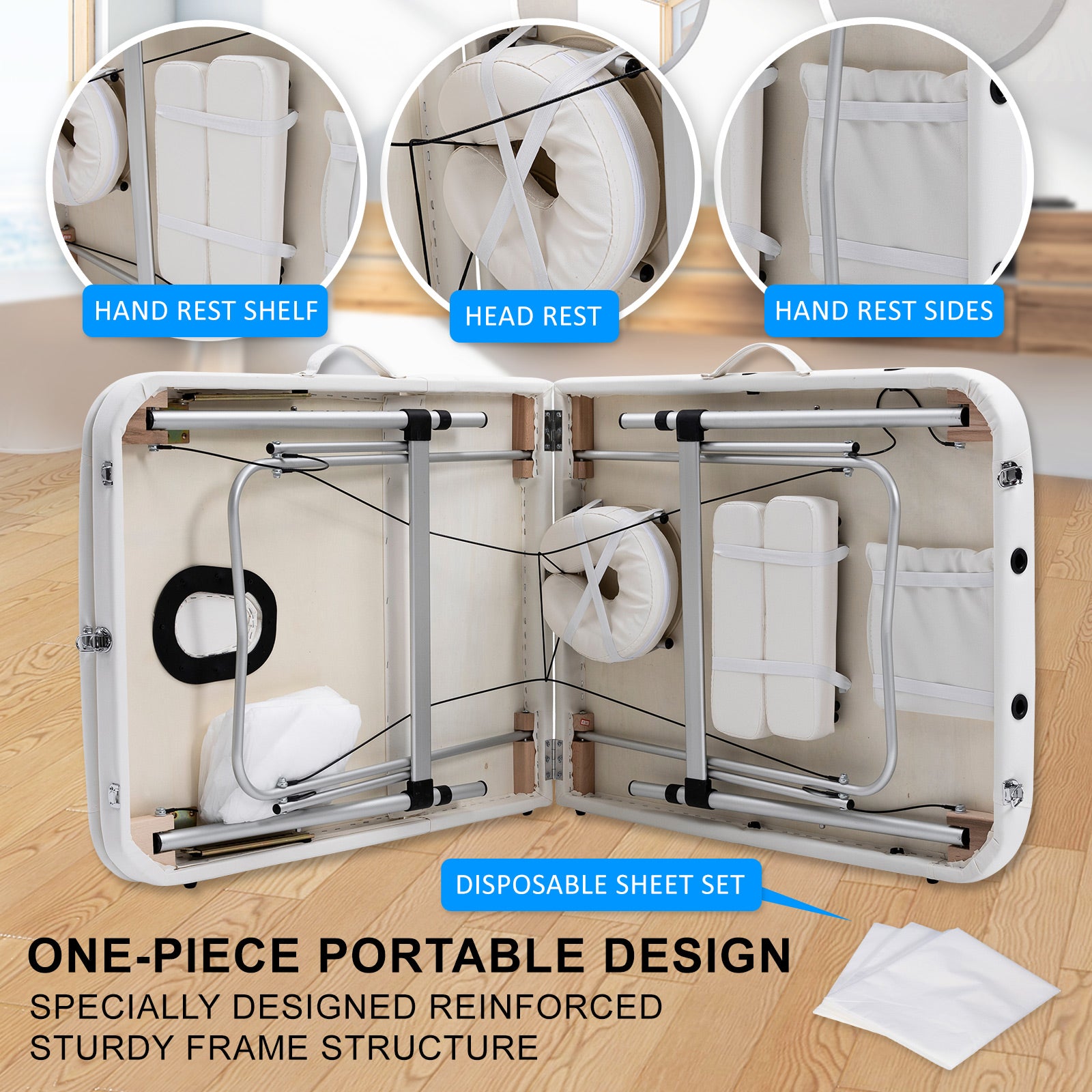 With an aluminium-made structure, it ensures that the table is light-weighted, allowing users to carry it to different places. However, this doesn't sacrifice its safety as it is equipped and reinforced with a w-shaped pole that goes across both legs. It helps increase the stability of the table, preventing it from toppling over. Furthermore, this latest design is harnessed with a Quick-Lock system, reducing hassles in opening and folding up the table. The legs are also equipped with 8 adjustable heights, to suit masseuses and beauty therapists of different heights, making sure they are working comfortably and providing their best service.
