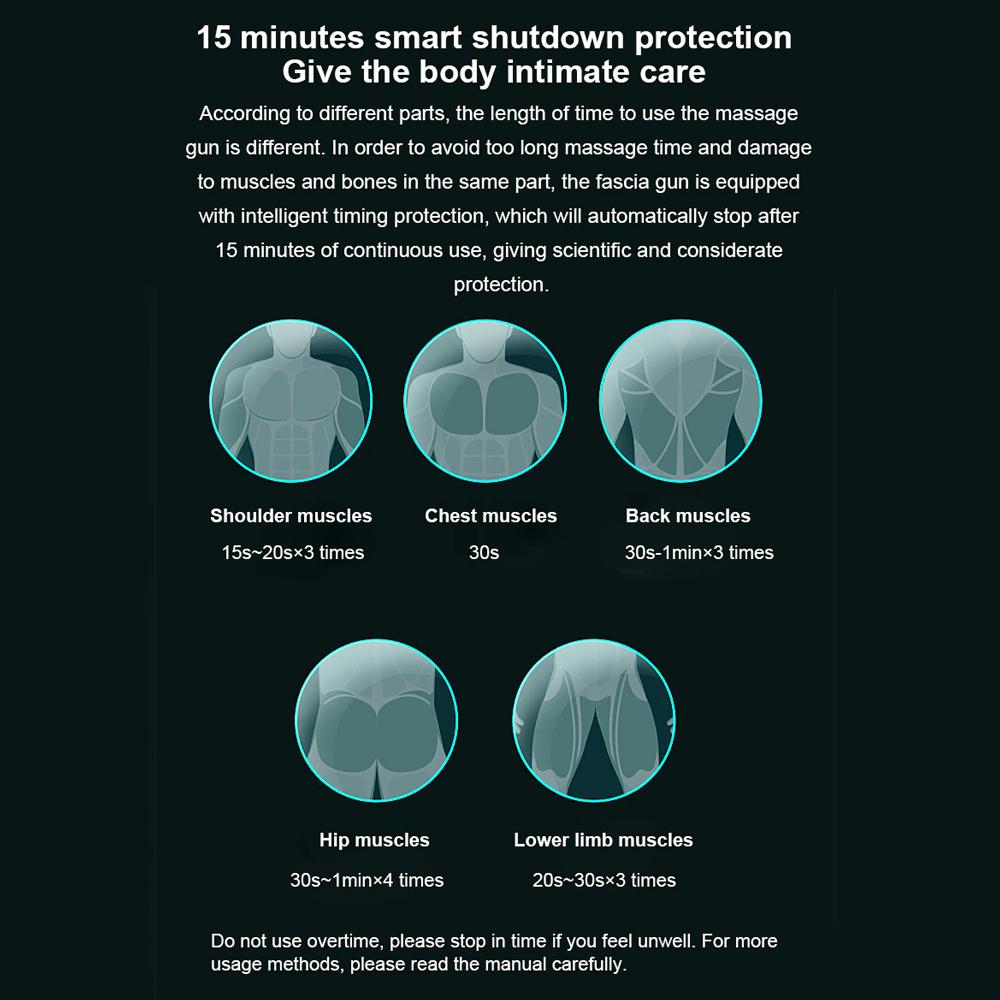 According to different parts, the duration of using massage gun is different. In order to avoid too long massage time and muscle and bone damage in the same part, the fascia gun is equipped with intelligent timing protection, which will automatically stop after 15 minutes of continuous use, providing scientific and considerate protection.