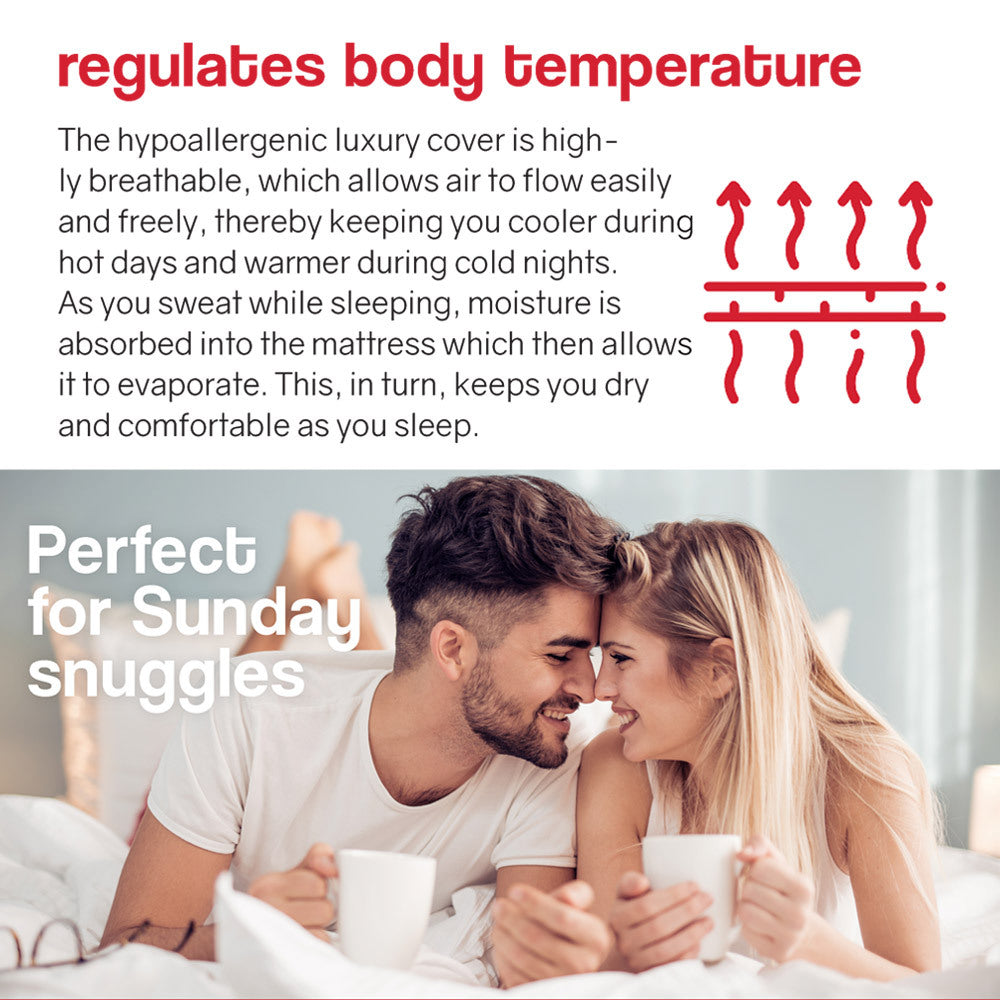 Kingston Slumber mattresses come with 6 Coil-5 Zone thick banded pocket springs that ensure you experience the most tranquil sleep. When you change position, the cushioning EuroTop exterior lining allows for an effective flow of air in and out of the mattress. All these features work in harmony to deliver a state-of-the-art therapeutic mattress solution that will provide consistency in your sleep cycle well into the future.