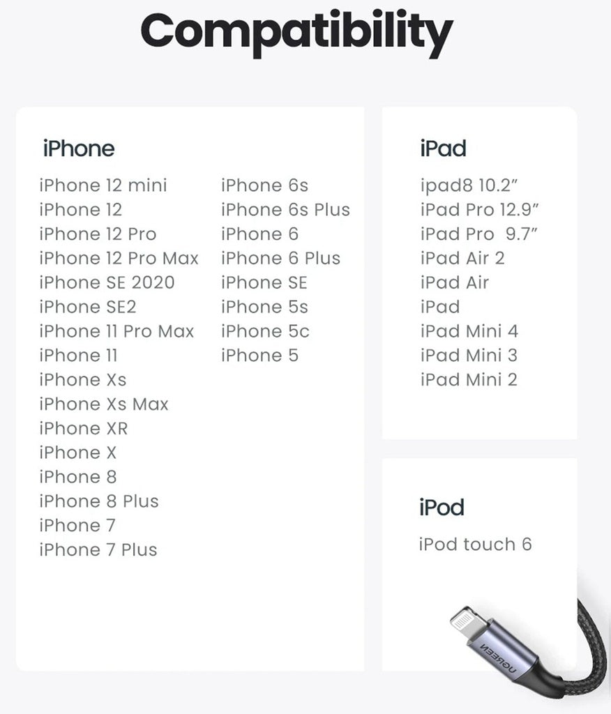 MFi certification ensures complete charge and sync compatibility with iPhone XS / XS Max / XR / X / 8 Plus / 8 / 7 Plus / 7 / 6s Plus / 6s / 6 Plus / 6 / 5s / 5c / 5 / iPad Pro / iPad Air / Air 2 / iPad mini / mini 2 / mini 4 / iPad 4th gen / iPod Touch 5th gen / iPod nano 7th gen