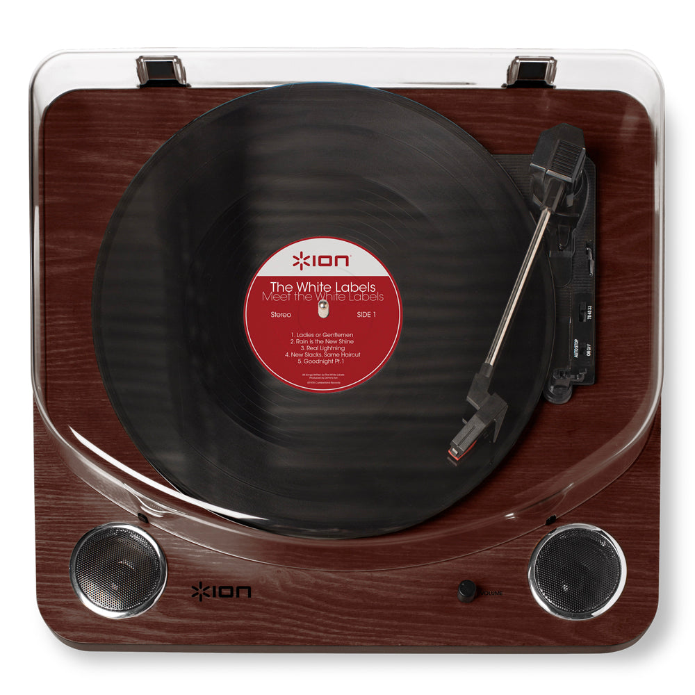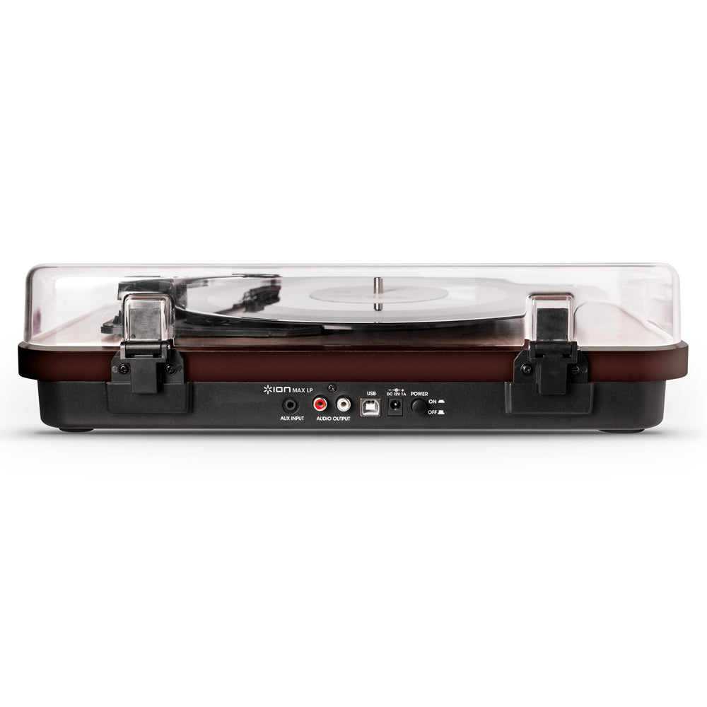 ION Audio Max LP Turntable - Darkwood - Rediscover your Vinyl record collection: Premium 3-speed turntable (33 1/3, 45, and 78 RPM) that plays every LP/record in your collection, completed in a luxurious darkwood finish.The centrepiece of your vinyl listening experience: 1/8 inch aux input to convert or playback from media sources; Standard RCA outputs to connect to external speakers and HIFI separates. Room-filling sound – Onboard built-in stereo speakers deliver punchy, crystal clear sound; no fuss, simply kick back and listen to your records. Update your library: Convert tracks into digital files via USB onto your PC or Mac with the included ION Audio EZ conversion software. Everything you need: Protective dust cover, 45 adapter, and felt Slipmat included