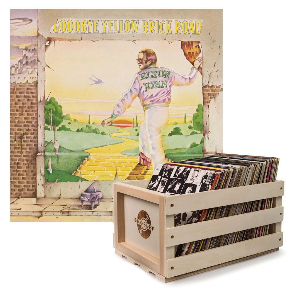 Crosley Record Storage Crate & Elton John Goodbye Yellow Brick Road - Double Vinyl Album Bundle