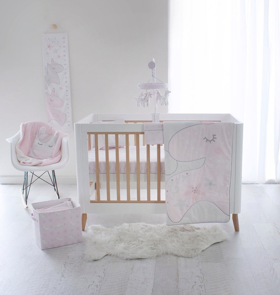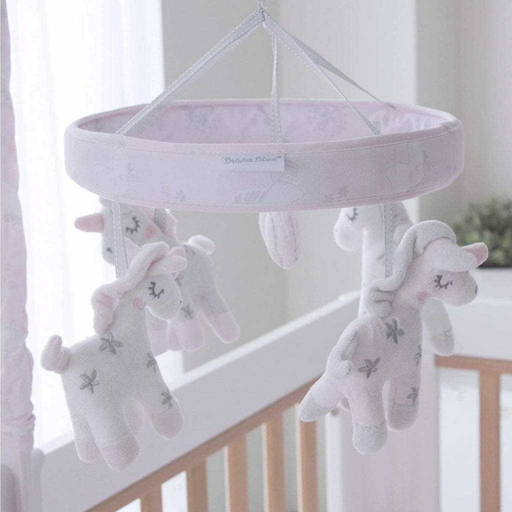With a simple wind up mechanism our musical mobile from the Bubba Blue Unicorn Magic collection soothes baby into a dreamy and relaxing sleep. This stylish, yet sophisticated collection has the perfect palette dreamy pinks and soft greys with crisp white, featuring magic unicorns and sweet hearts. Do you believe in magic?