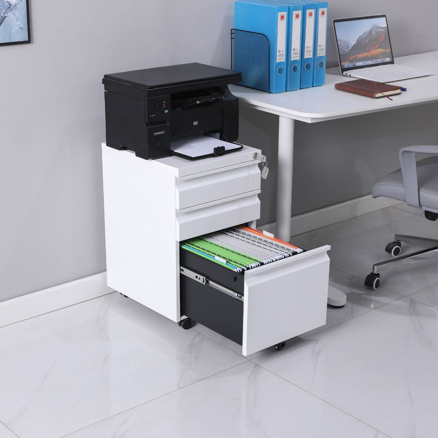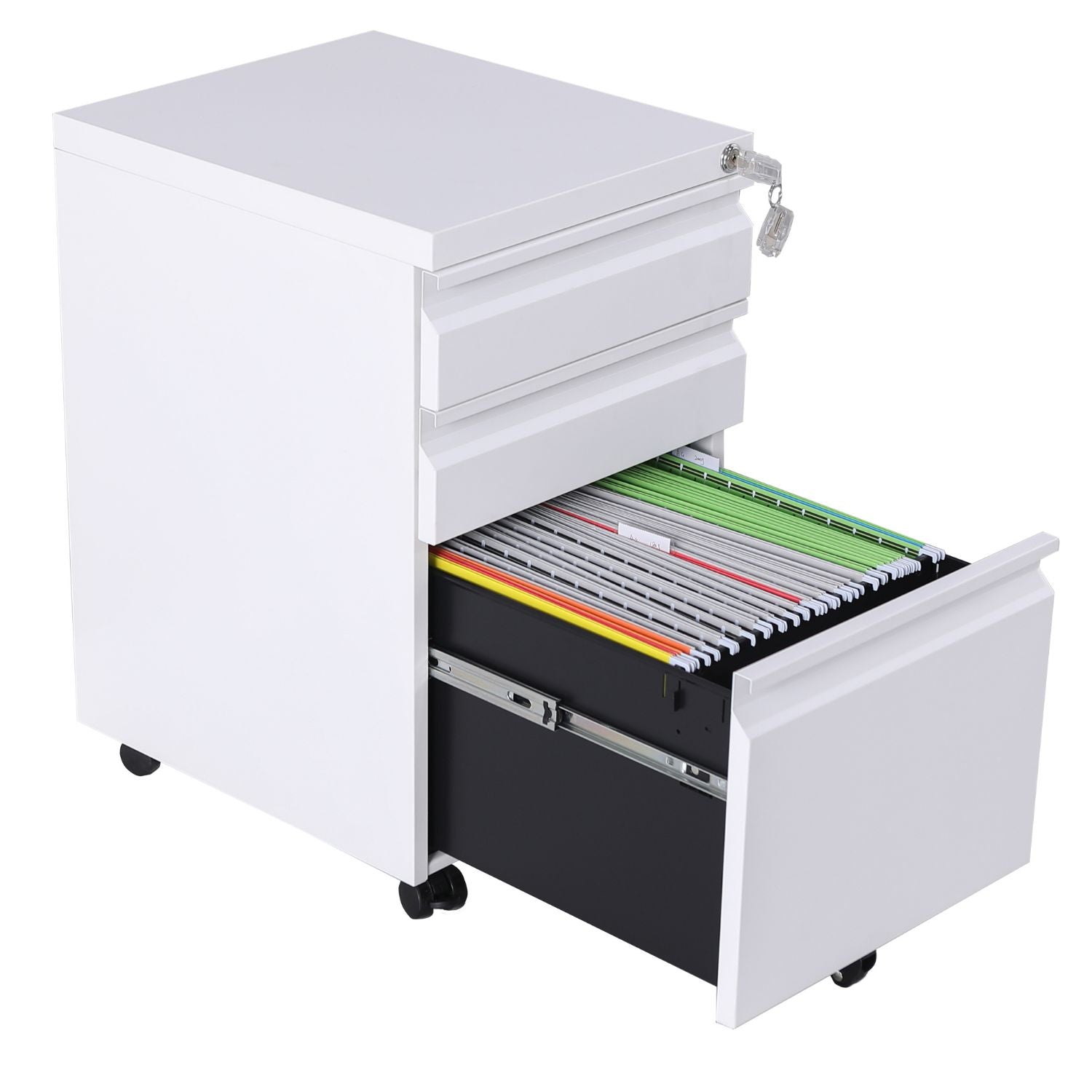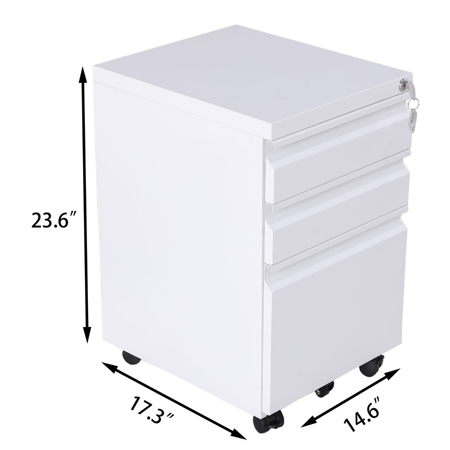 Secure Locking and Stability with Lockable Wheels: Enhance security and stability with the file cabinet's lockable wheels. Two lockable wheels provide stability when needed, preventing unintentional movement, while one auxiliary wheel under the file drawer prevents tipping. These features offer peace of mind, ensuring that your cabinet stays securely in place.