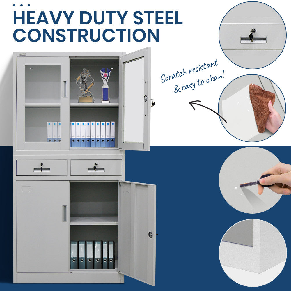 Designed and built with security in mind, the FORTIA 4 Door + 2 Drawer Storage Cabinet has been constructed from high-grade steel, with each shelf being capable of holding as much as 20kg. There are also 2 drawers conveniently positioned in the middle which are ideal for storing smaller items and other office supplies.