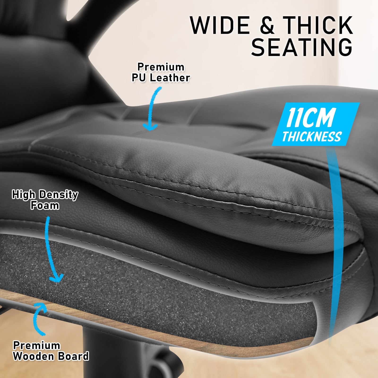 Its clever design conforms to the natural curve of the spine, includes a padded headrest. Plus, its upholstery crafted from premium PU leather with extra lumbar support greatly helps you sit up straight and alleviate pressure on your lower back. In other words, say goodbye to neck and back pain. To add arm comfort, avoid carpal tunnel syndrome, the armrests are made padded and are slightly curved to fit under your desk easily.