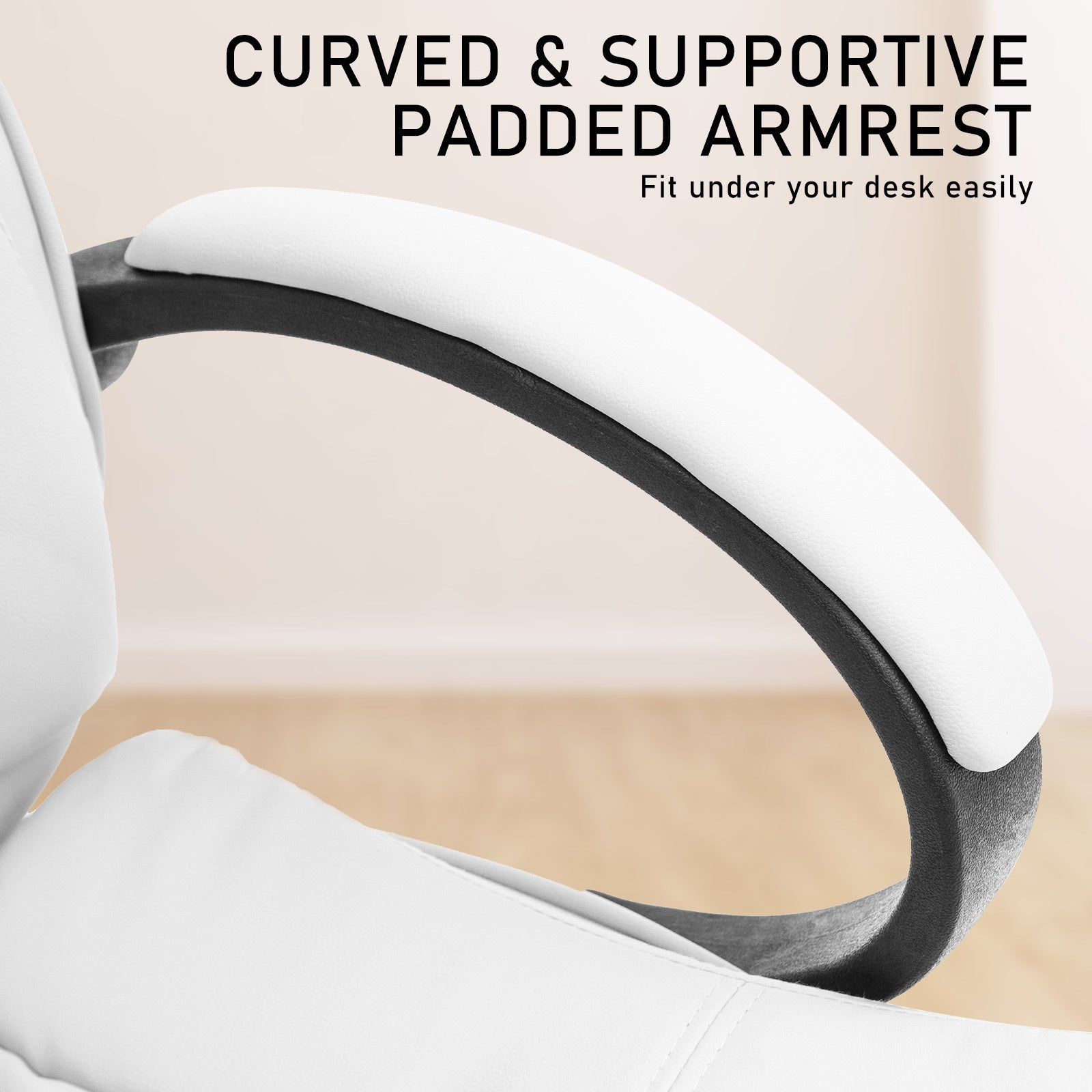 Its clever design includes a padded headrest and built-in lumbar support that conforms to the natural curve of the spine. Plus, its upholstery is crafted from premium PU leather with a dual-layer back and seat cushion. To add comfort, the padded armrests are made wide that offer considerable support to the upper torso and shoulders.