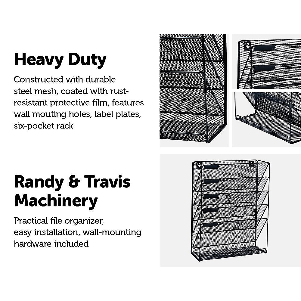 Keep your files organized and your desk clear with this wall-mounted six-pocket file organizer rack from Randy & Travis Machinery. With its sleek, upright profile, this rack takes up little space on your wall, but keeps your desk clear for current work.