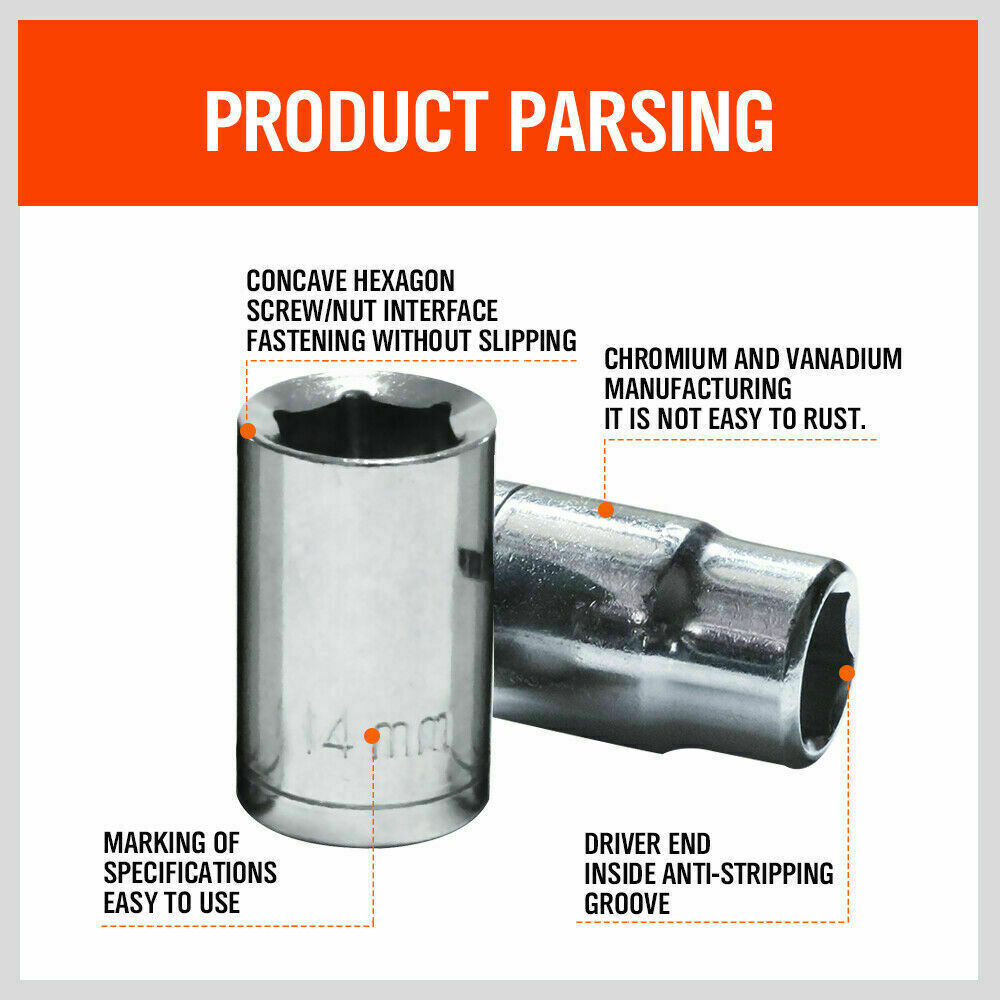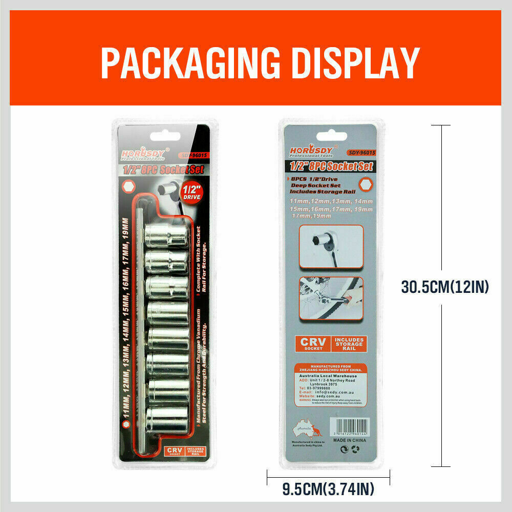Set Includes(1/2" Drive): 11, 12, 13, 14, 15, 16, 17, 19 mm