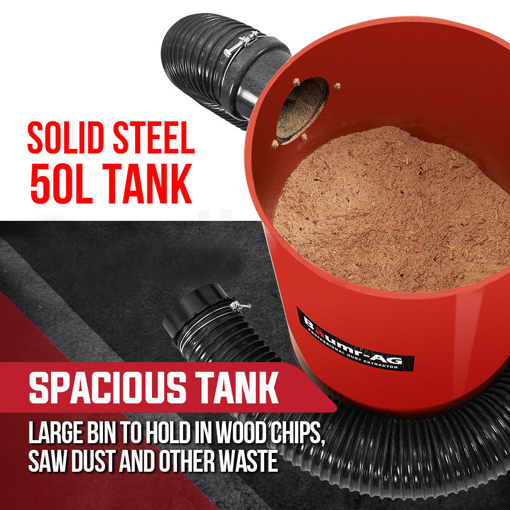 Professional workshops have long known that one of the most essential pieces of machinery in the workshop is an adequate extractor. Fine particles can be sucked into electrical components and build up of dust can become a fire hazard. Worst of all, these particles can find their way into your lungs! Thanks to the Baumr-AG Woodworking Dust Collector, you no longer have to worry about these issues in your small professional or hobby woodworking shop.