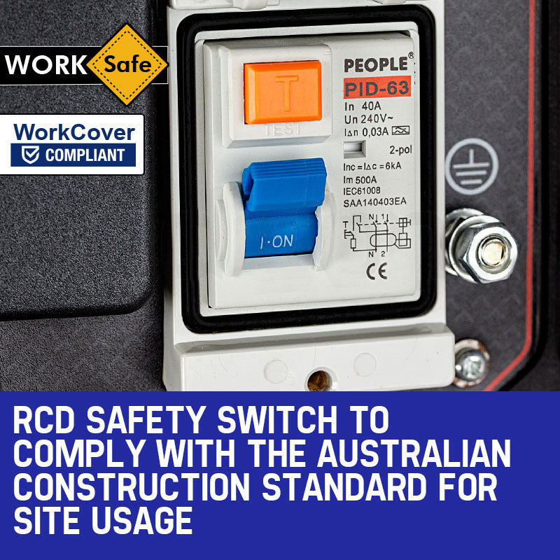 With an RCD Safety switch and external earth point, the GX4335i is WorkCover compliant. Meeting the Australian Construction Standard, this WorkSafe spec model is ideally suited to providing power on construction and mining sites, trade shows and special events. This dependable workmate is housed in an ultra-rigid frame, and with an oversized 15 litre fuel tank capacity it can run for up to 9 hours unattended.