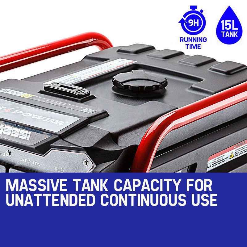 The GX4335i features Throttle and Digital Voltage Control employing GenPower's Patented AVR (Auto Voltage Regulator) ensuring stable voltage supply. This class-leading model offers total flexibility with 2 x 240V IP rated protected outlets, plus a 12V 8.3Amp battery charging outlet.