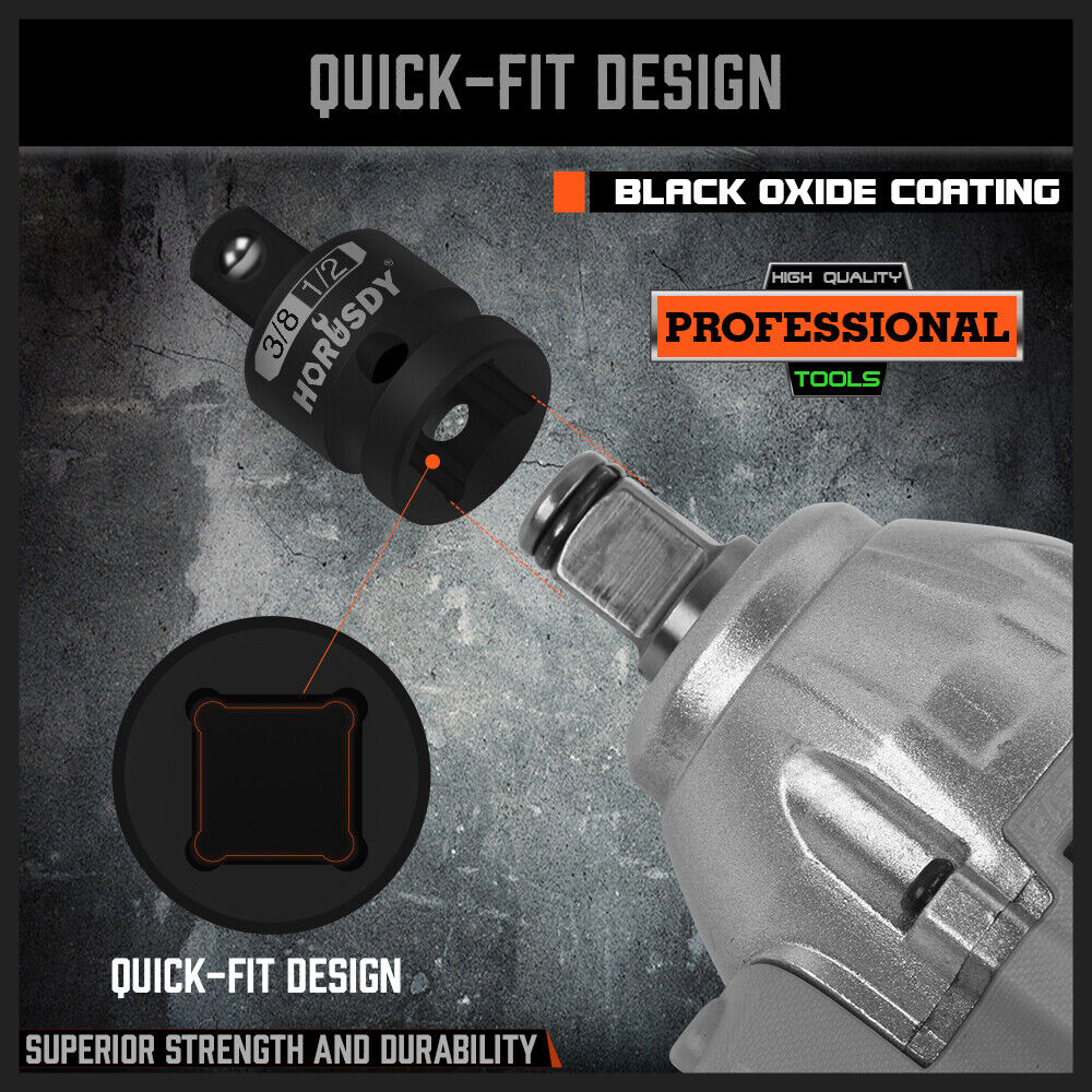 • 5PCS SET INCLUDES: 2 reducers in 3/8” female to 1/4” male and 1/2” female to 3/8” female. 3 adapters in 1/4" female to 3/8” male, 3/8”female to 1/2” male, 1/2"female to 3/4male to convert all your impacts to different size sockets.