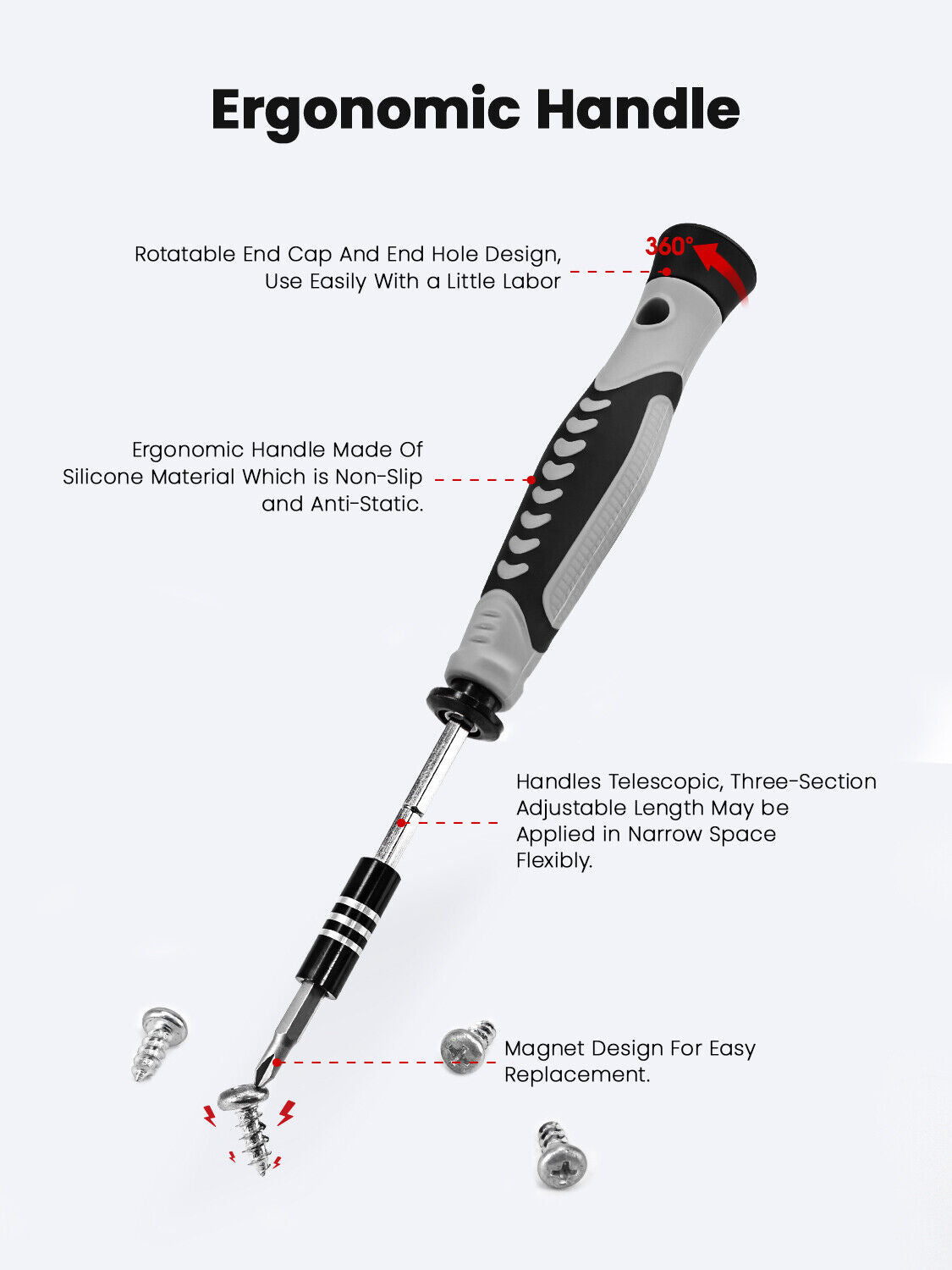 Magnetic Bits: The mini screwdriver storage box and handle are designed with a magnetized area, which is convenient to store the screwdriver bit, and the magnetic tip can attract tiny screws to avoid losing or falling.