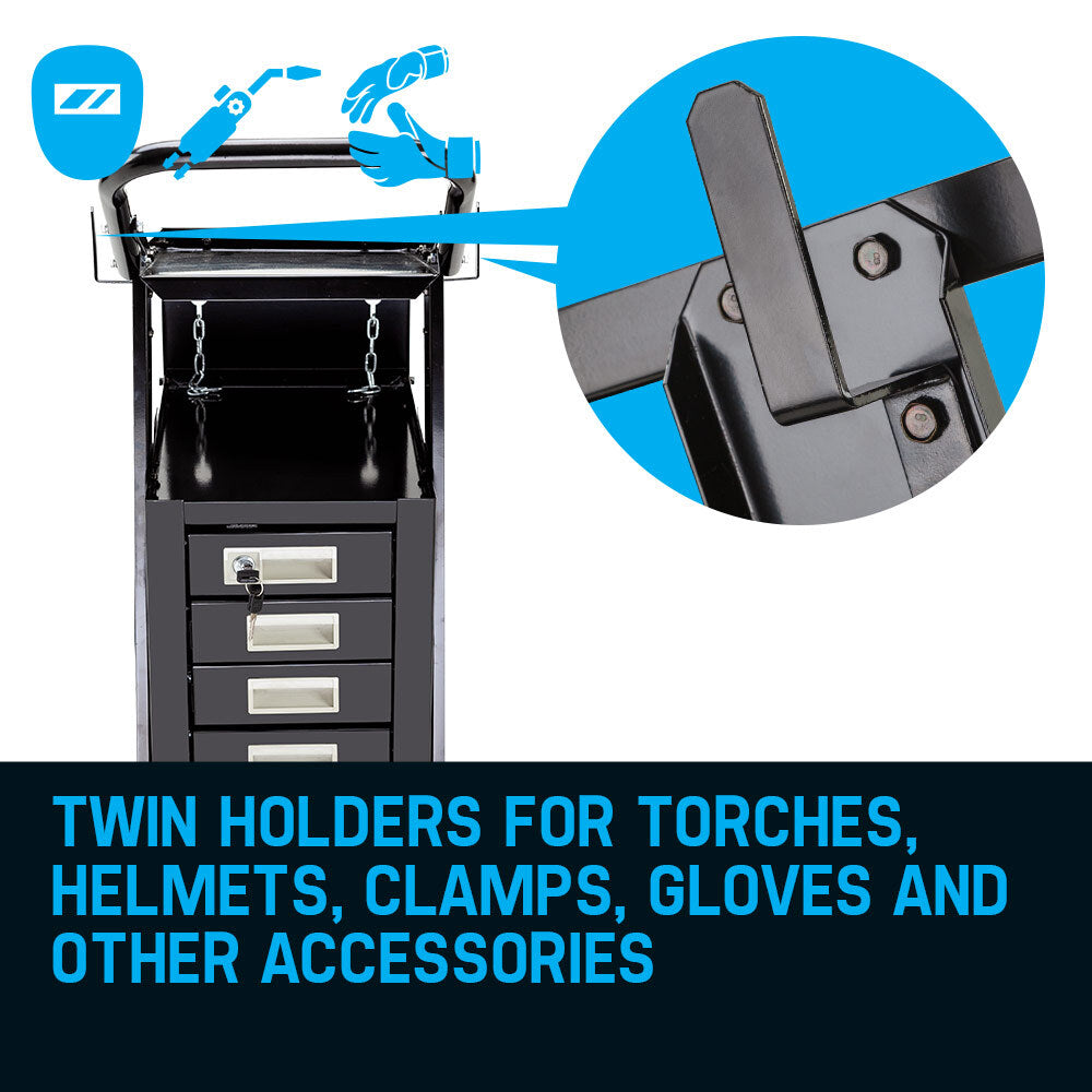 In search of the perfect weld, you should forget all worries behind and steady your hand. The Rossi Deluxe makes sure you can. With four storage drawers and twin hooks there's plenty of space for the welding unit, wires, rods, mask, tungsten nozzles and everything else that's required for a successful fusion, you can focus entirely on the work at hand. And you can work quickly, too; thanks to its solid-rubber rear wheels and nimble 360° swivelling front wheels with brake, your Rossi Deluxe is a breeze to move around the workshop.