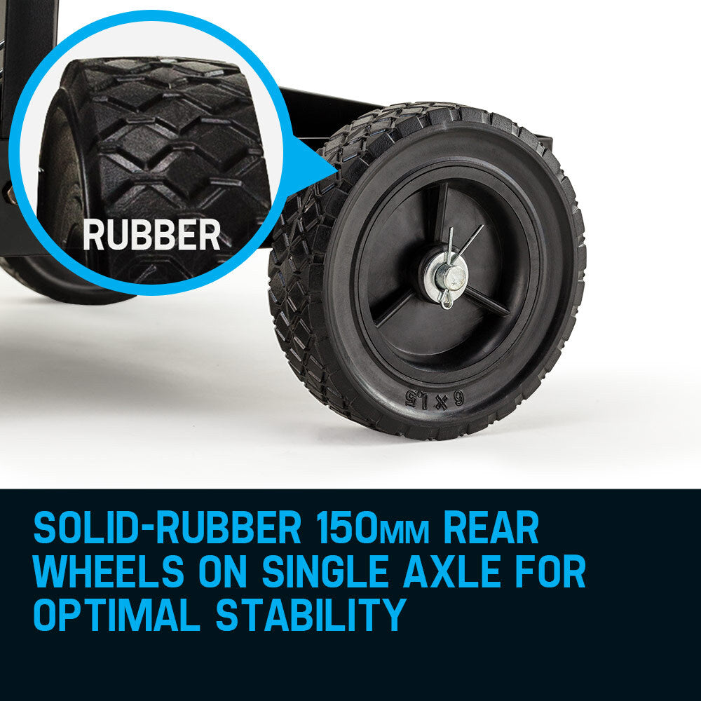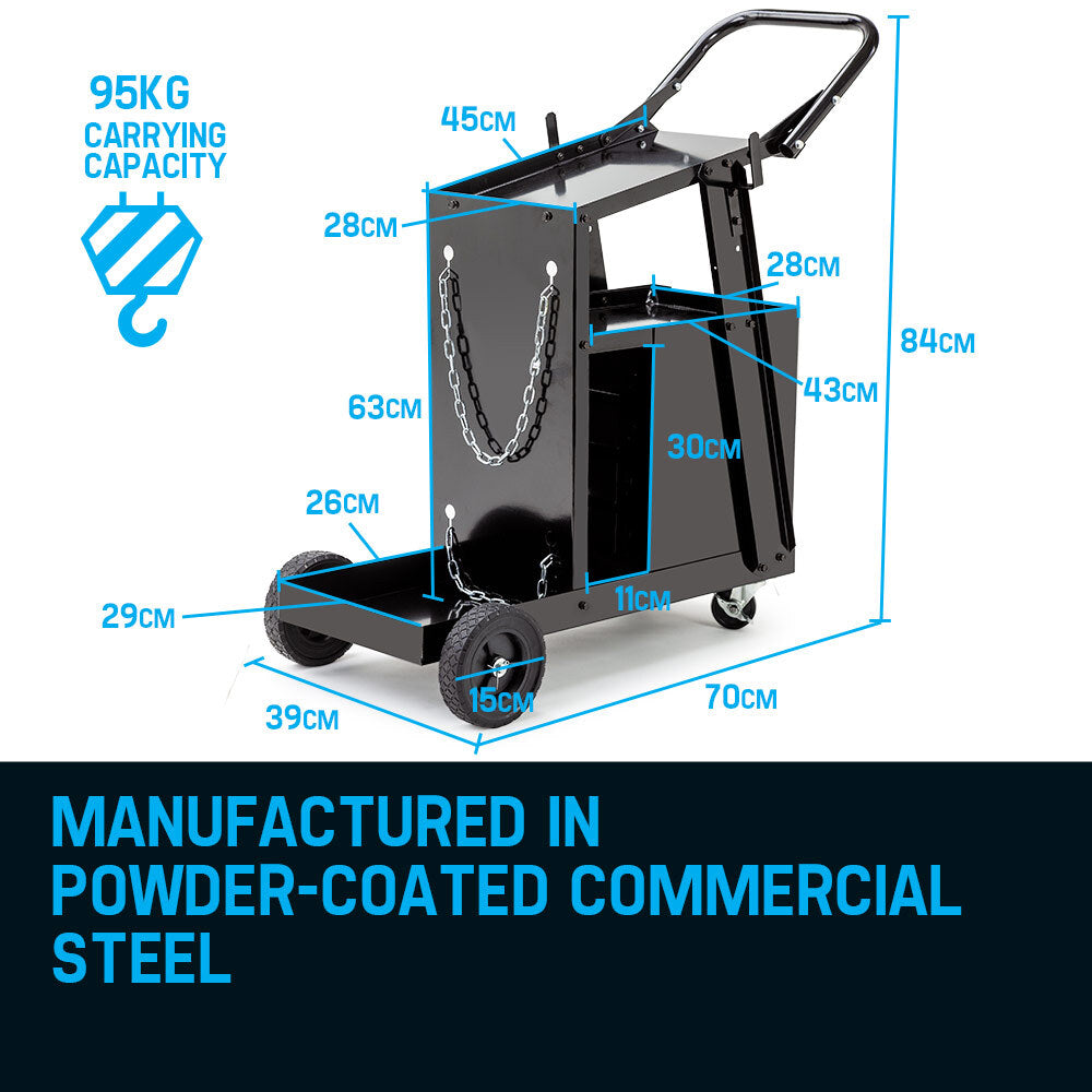 Of course, fun as it is, welding does ask for a strict safety protocol - and you can rest assured that the Rossi Deluxe ticks the boxes. Designed in powder-coated commercial steel, it features solid build quality throughout, with details such as a single wheel axle, spring washers and double tank chains being a given. This translates into a carrying capacity of some 95kg; you can load her up to your heart's content.