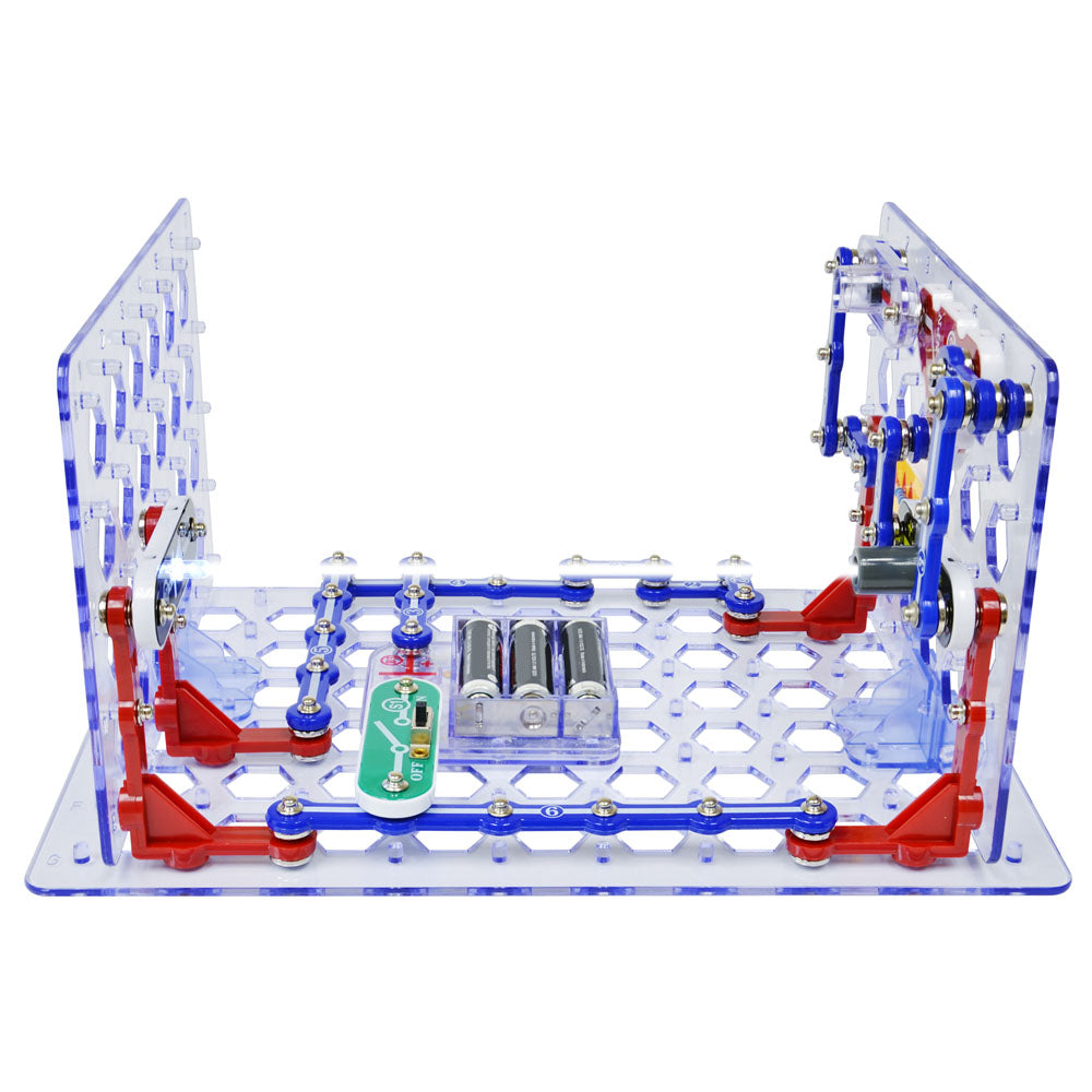 Snap Circuits®3D Illumination uses building blocks with snaps to build the different electrical and electronic circuits in the projects. Each block has a function: there are switch blocks light blocks battery blocks different length wire blocks etc. These blocks are different colors and have different numbers on them so that you can easily identify them. Build over 150 projects or combine with other sets to build even more unique structures. Exciting Light Effects. 3-Color Light Tunnel Mirrors & Reflecting Circuits Magnet & Magnetic Switch Projector with 6 Images Includes vertical stabilizer base grid stabilizer & base grid support 3 AA batteries required but not included.
