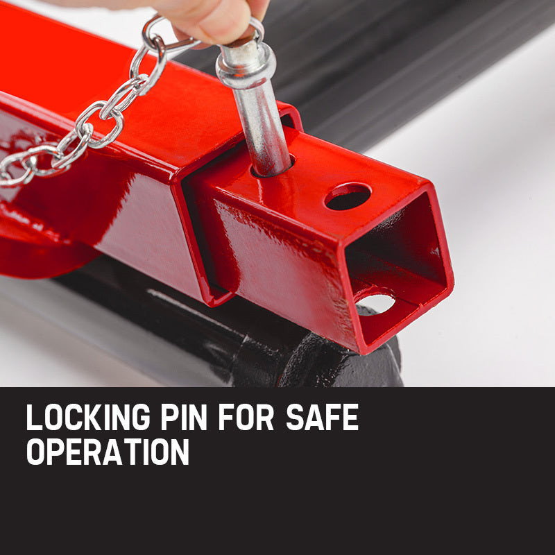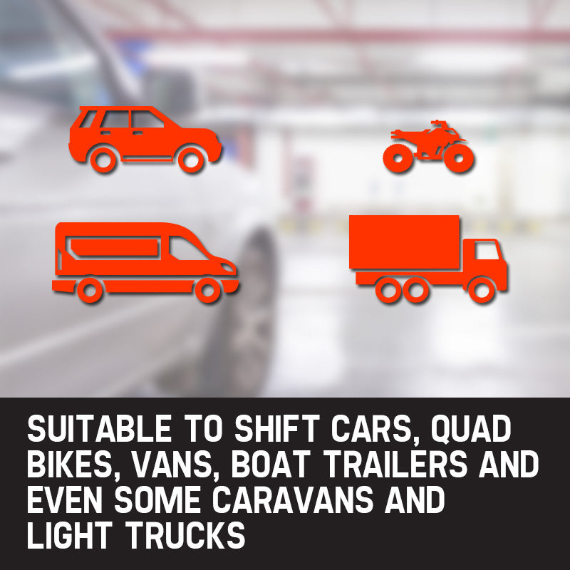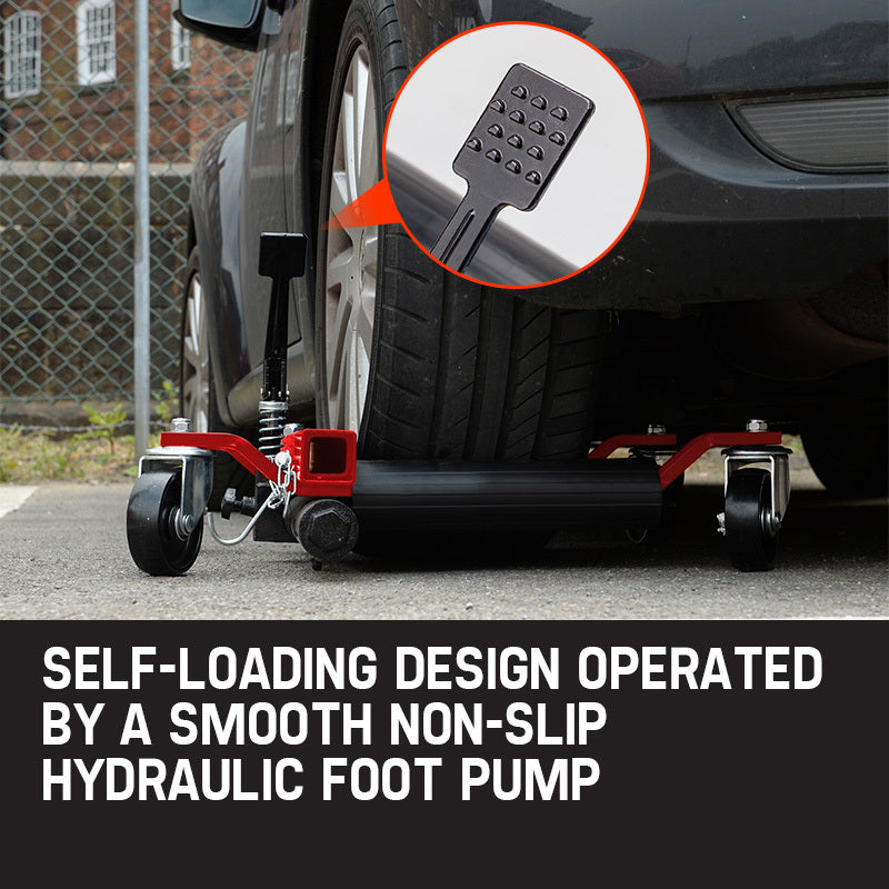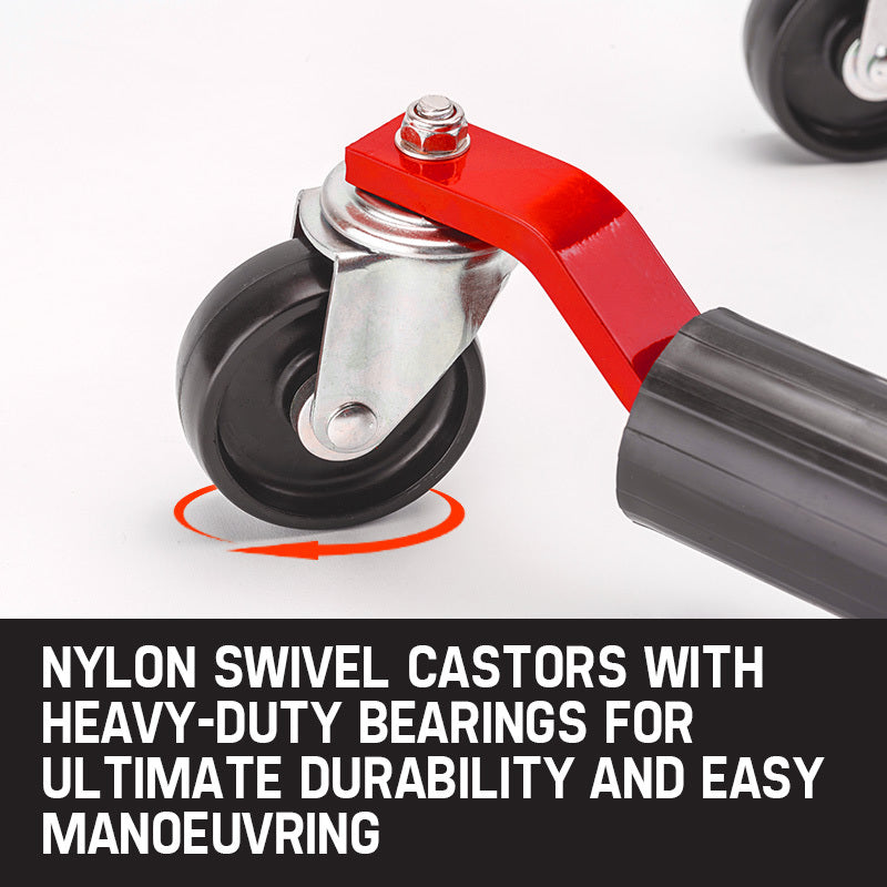 The smooth foot operated hydraulic ram squeezes the support legs together to lift the tyre off the ground, and the locking pin ensures optimum safety. Heavy-duty nylon swivel castor wheels enable the rolling of cars, quad bikes, vans and light trucks into tight areas with ease. Relocating non-running vehicles or shells will never again be a drama!